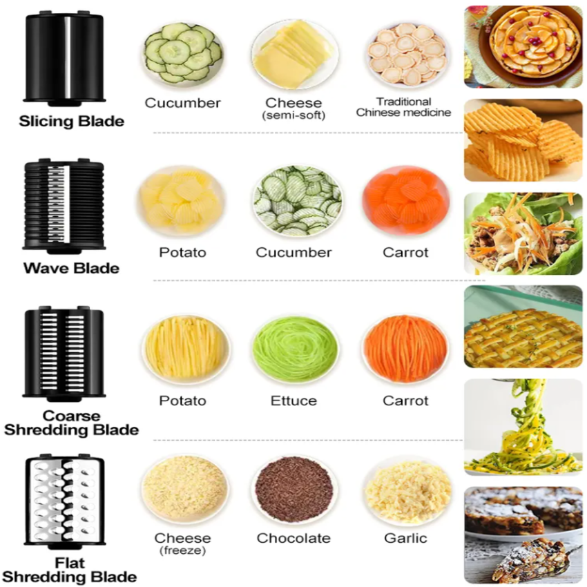 - Nhờ hệ thống lưỡi dao bố khoa học, sắc bén có thể cắt tất cả các loại rau củ quả khác nhau.