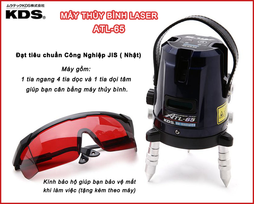 • Máy thủy bình laser 4 tia KDS ATL-65 được hãng KDS sản xuất nên chất lượng đạt tiêu chuẩn Công Nghiệp JIS ( Nhật).