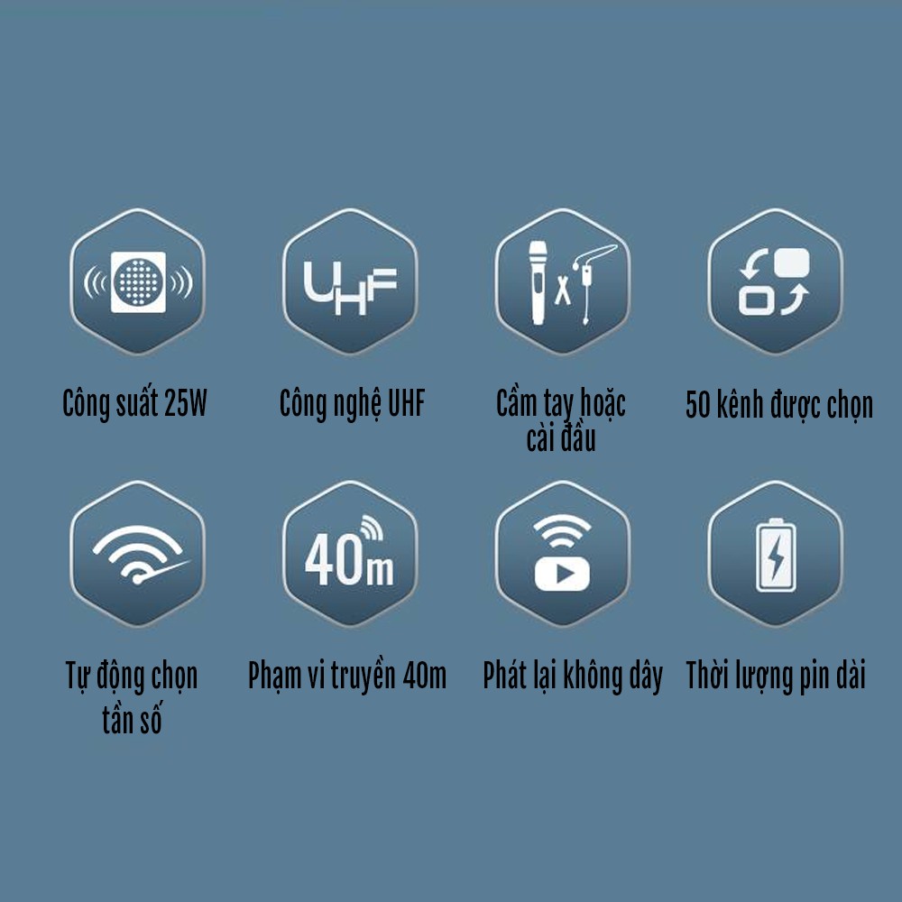 - Công xuất : 25W - Hỗ trợ Bluetooth 4.1, phát nhạc từ thẻ nhớ TF, USB F - Công nghệ UHF tần số cao , thu phát không dây khoảng cách lên đến 30 m. - Thời gian