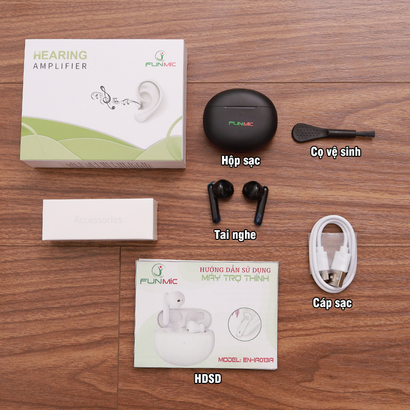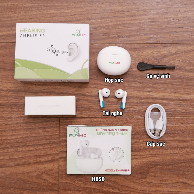 Không đeo máy trợ thính khi tắm, bơi lội, khi trời mưa to hoặc trong bầu không khí ẩm ướt như phòng tắm hơi. Thông số kỹ thuật của tai nghe trợ thính Funmic EN-IA013A: Model: EN-IA013 Thương hiệu: Funmic Âm thanh khuếch đại tối đa: <117dB SPL Âm thanh khuếch đại trung bình: <111dB SPL Tăng âm thanh tối đa: <40dB Tăng âm thanh trung bình: <35dB Độ méo tiếng: ≤5% Dải tần số: F1≤250Hz, F2≥5000Hz Tiếng ồn đầu vào: <32dB Cường độ dòng điện: ≤5mA Pin sạc: Lithium Thời gian sạc tai nghe: khoảng 2 giờ Trọng lượng sản phẩm: 3.5g Kích thước sản phẩm: 32.8 x 16.7 x 17.6 mm Kích thước đóng gói: 120 x 90 x35 mm Trọng lượng đóng gói: 137g Màu sắc: Trắng/đen Sản phẩm đạt giấy chứng nhận ISO13485,CE、RoHS Sản phẩm bao gồm: