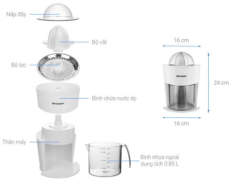 Máy vắt cam Sharp thiết kế gọn nhẹ, màu trắng sáng tươi trẻ, có tay cầm chắc chắn Chuyên dụng để vắt các loại hoa quả họ cam như cam, bưởi, quýt, chanh,… đáp ứng nhu