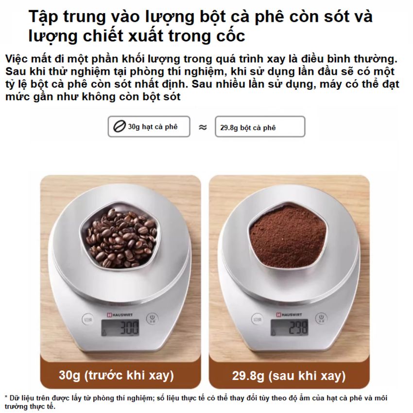 - Ống xả từ tính có thể tháo rời, lưỡi xay trên và phễu đựng hạt có thể tháo rời, kèm dụng cụ nén bột để làm sạch bã cà phê còn sót lại. * Thông số kỹ thuật: