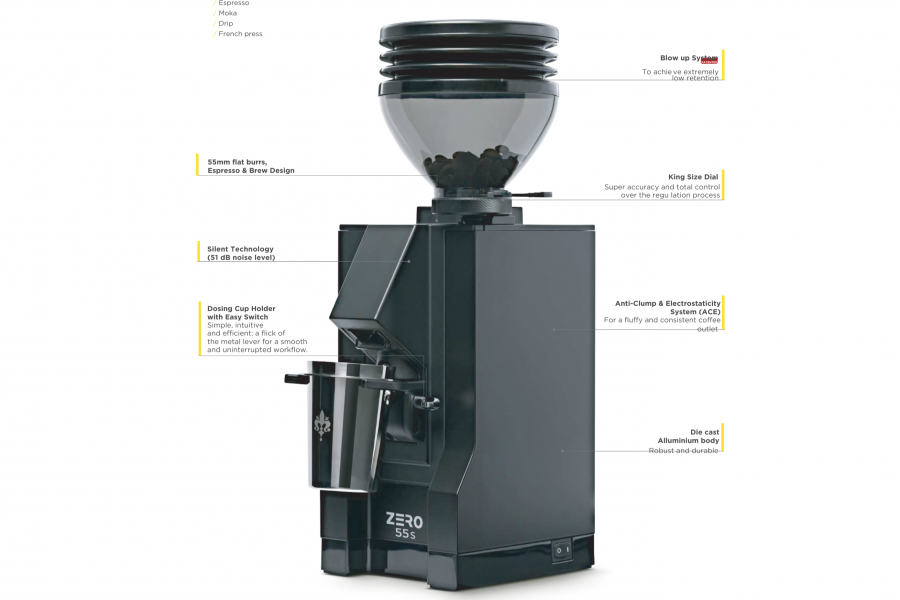 Máy Xay Cà Phê Eureka Mignon Zero 55 S Eureka Mignon Zero 55 S là máy xay cà phê chính xác cho barista tại nhà, với lưỡi dao 55mm, hệ thống gạt định lượng nhanh chóng và Blow Up Cleaning giúp giữ cà phê luôn tươi mới, đảm bảo độ đồng nhất trong từng lần xay.