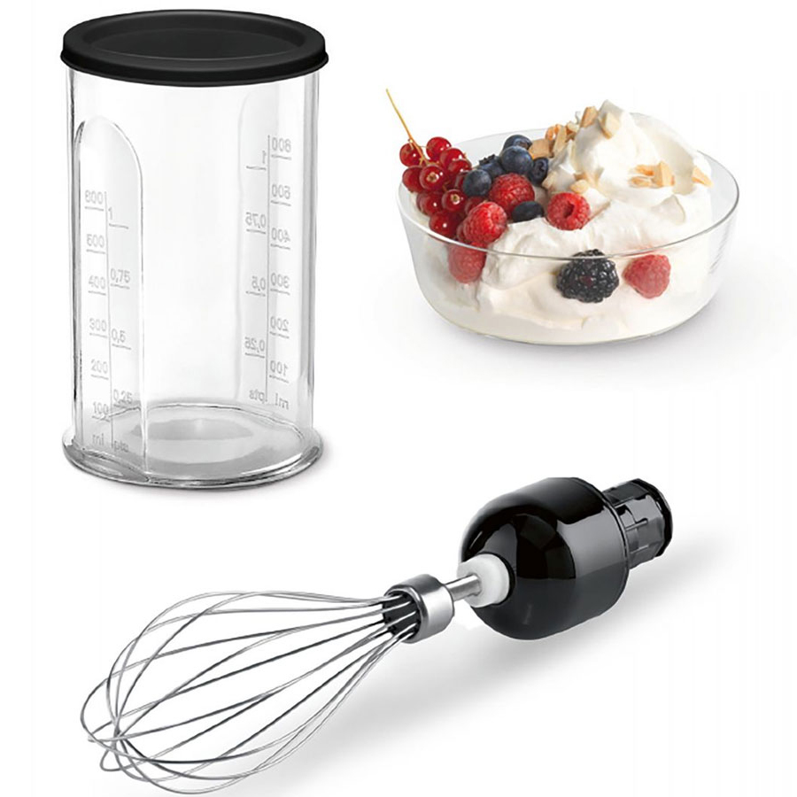 Máy xay cầm tay có thiết kế thon gọn và tiện dụng cùng tay cầm chống trượt đảm bảo an toàn khi chế biến món ăn. Máy đi kèm các phụ kiện như: 1 trục khuấy trứng, 1 cối xay và 1 cốc đựng, 1 lưỡi xay đá viên và đá non rất tiện dụng cho bạn trong việc chế biến các món ăn.