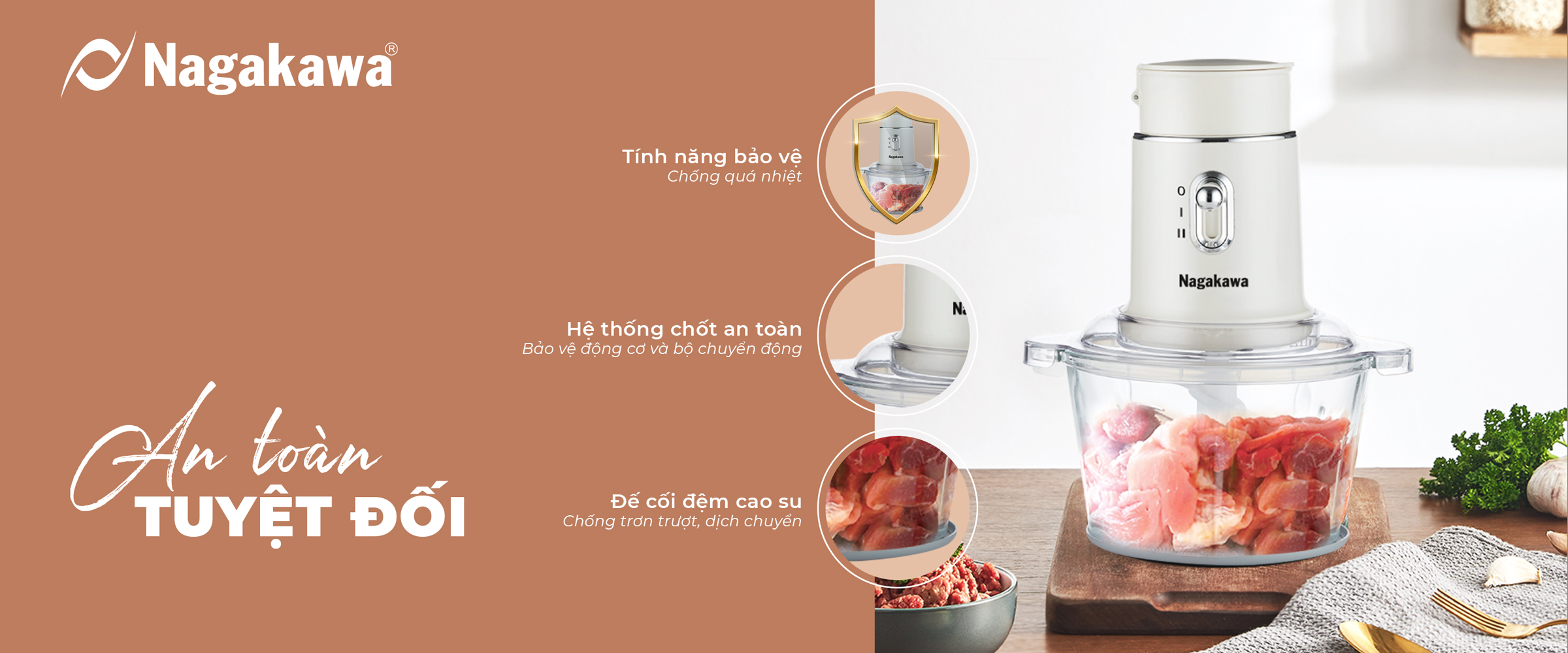 Để tạo nên những món ăn ngon, quá trình nấu nướng có thật nhiều công việc nhỏ nhặt, đó có thể là xay thịt, xay sinh tố, xay đồ khô, hay bóc tỏi. Hiểu được sự vất vả của người nội trợ, Nagakawa cho ra đời máy xay đa năng Nagakawa NAG0823. Sản phẩm tích hợp nhiều công năng giúp tiết kiệm thời gian nấu nướng và tối ưu đồ gia dụng trong bếp. Đa chức năng Máy xay đa năng Nagakawa NAG0823 có công suất là 250W, thỏa mãn 4 công năng: Xay thịt, xay sinh tố, xay đồ khô, bóc tỏi. Tích hợp 4 chức năng trong một giúp bạn tiết kiệm chi phí sắm đồ gia dụng, chỉ cần một sản phẩm để giải quyết nhiều vấn đề. Bên cạnh đó cũng tiết kiệm chi phí và tối ưu diện tích lưu trữ. Cối xay thủy tinh cao cấp Máy xay đa năng Nagakawa NAG0823 có cối xay thủy tinh cao cấp an toàn cho sức khỏe, tuyệt đối không thôi nhiễm chất độc hại khi tiếp xúc với thực phẩm. Chất liệu này cũng có độ bền cao, hạn chế trầy xước trong quá trình sử dụng, dễ dàng vệ sinh. với độ trong suốt cao, giúp cho người dùng có thể dễ dàng quan sát tình trạng của các loại nguyên liệu bên trong. Với dung tích 1,5 lít, bạn có thể chế biến lượng lớn thịt trong một lần xay, đáp ứng bữa cơm cho cả gia đình. Lưỡi dao inox 304 Lưỡi dao cấu tạo từ inox 304 vô cùng sắc bén, xay chém hoàn hảo các món thịt, sinh tố, đồ khô. Chất liệu inox 304 có ưu điểm là không thôi nhiễm chất độc hại, sáng bóng với thời gian, hạn chế trầy xước, độ cứng tốt, độ bền cao. Hứa hẹn cho ra đời các món xay hoàn hảo, đạt tiêu chuẩn. Chức năng chống trơn trượt Máy xay đa năng Nagakawa NAG0823 được trang bị đế cối đệm cao su, giúp chống trượt, đảm bảo an toàn. Ngoài ra còn hạn chế tiếng ồn khi vận hành, tạo cảm giác thoải mái cho người sử dụng. Tính năng bảo vệ chống quá nhiệt Sản phẩm được trang bị rơ le tự ngắt khi quá tải, khi máy vận hành trong thời gian dài và nóng quá mức cho phép, máy sẽ tự ngắt. tính năng này giúp nâng cao tuổi thọ của máy, giúp sản phẩm bền bỉ hơn; Đồng thời cũng bảo vệ sự an toàn của người sử dụng, tránh tình trạng chập cháy khi hoạt động quá tải. Ngoài ra sản phẩm còn có hệ thống chống an toàn bảo vệ động cơ và bộ chuyển động.