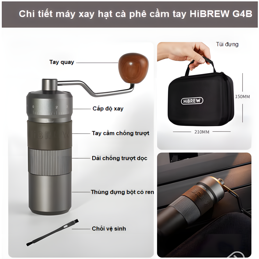 ✨Máy xay hạt cà phê cầm tay chuyên nghiệp, lưỡi xay 6 cánh core kép, 55 cấp độ và 11 level thương hiệu HiBREW G4B - Hàng Nhập Khẩu