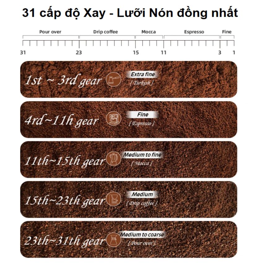 - Với lưỡi dao chất liệu thép không gỉ SS420 bền bỉ bền bỉ sở hữu 31 cấp độ xay, từ dạng thô đến dạng mịn. Chính vì thế nó có thể đáp ứng tối thiểu độ mịn cho 1 ly cà phê espresso chuẩn Ý. Thông số kỹ thuật