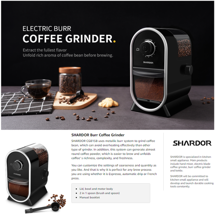 ✨Máy Xay Hạt Cà Phê Shardor CG815B Thương Hiệu Anh Quốc, Công suất 100W, Lưỡi Xay Burr - HÀNG NHẬP KHẨU, BẢO HÀNH 12 THÁNG
