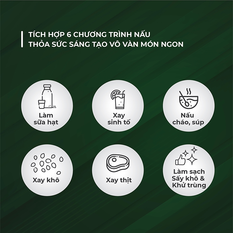 - Cối thủy tinh chính: Nấu sữa hạt, cháo/ súp và các loại đồ uống khác- Cối xay đồ khô: Các loại hạt, tỏi, ớt…