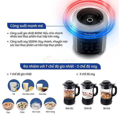Máy xay nấu đa năng Bluestone BLB-6033 Công suất xay: 800W; Công suất nấu: 800W 6 chế độ gia nhiệt: sữa hạt, sữa đậu nành, hâm nóng/giữ ấm, cháo, súp, sữa bắp. 3 chế độ