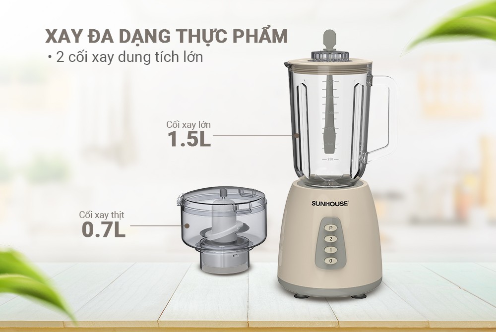 Xay đa dạng các loại thực phẩm Với 2 cối xay dung tích lớn 1.5L và 0.7L, máy xay sinh tố Sunhouse SHD5331 không những đáp ứng nhu cầu xay nhiều của gia đình mà còn giúp xay đa dạng các loại thực phẩm khác nhau, từ trái cây đến thịt, cá, ….