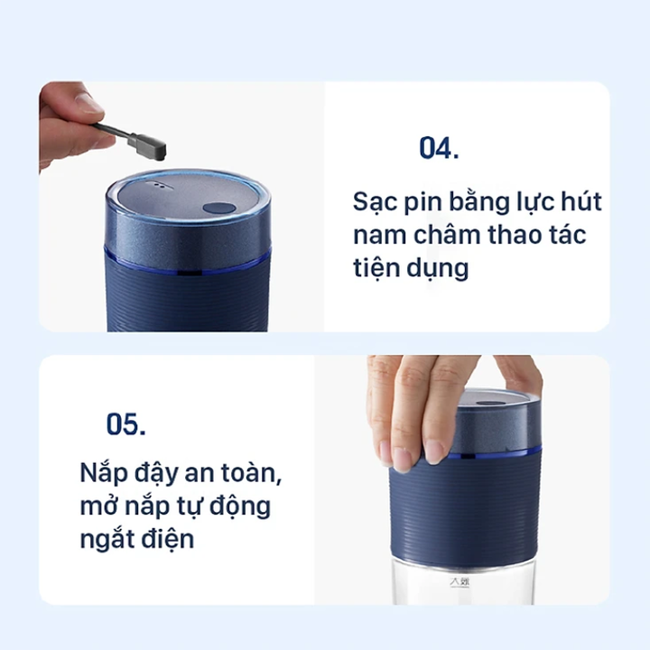 - Máy thiết kế sạc không dây, Dung lượng pin máy siêu lớn 1200mAh có thể xay 15 - 18 ly nước ép khi được sạc đầy pin. Tạo ga độc đáo cho hiệu quả giải khát tuyệt vời