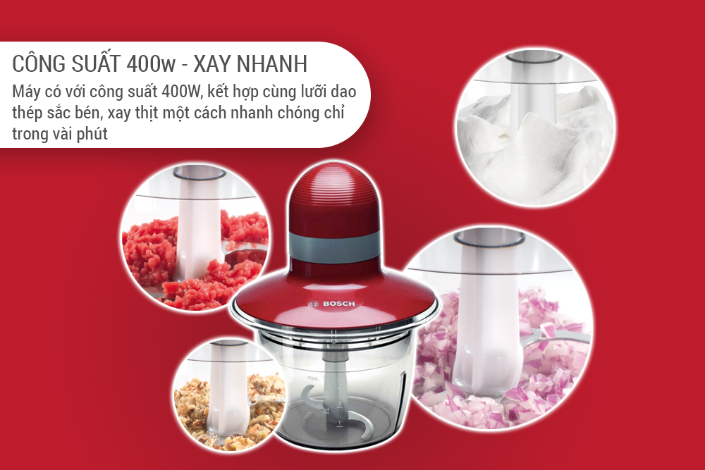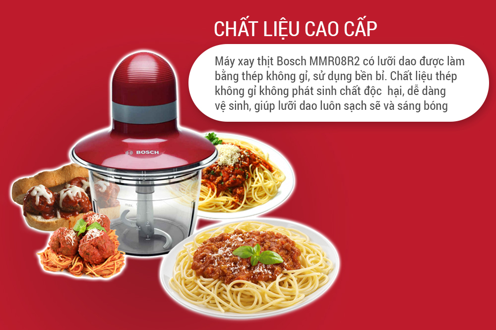 Thương hiệu Bosch Model MMR15A1 Sản xuất tại Slovenia Loại máy xay Máy xay thịt Chức năng - Xay thịt - Xay gia vị - Xay rau củ - Xay đá lạnh - Đánh bông
