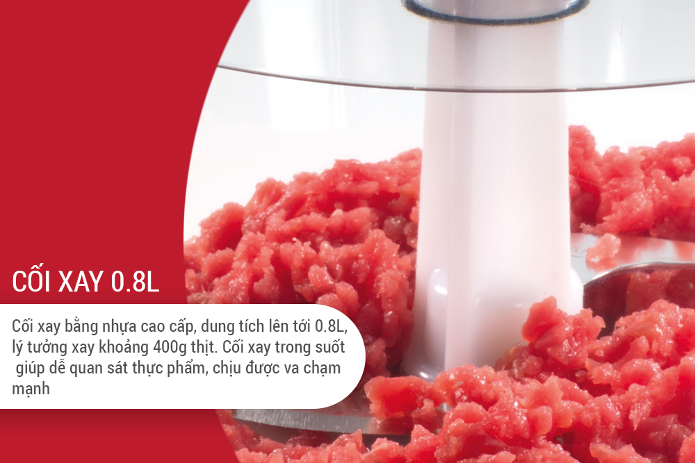 Cối xay bằng nhựa cao cấp, dung tích lên tới 0.8L, lý tưởng xay khoảng 400g thịt. Cối xay trong suốt giúp dễ quan sát thực phẩm, chịu được va chạm mạnh.