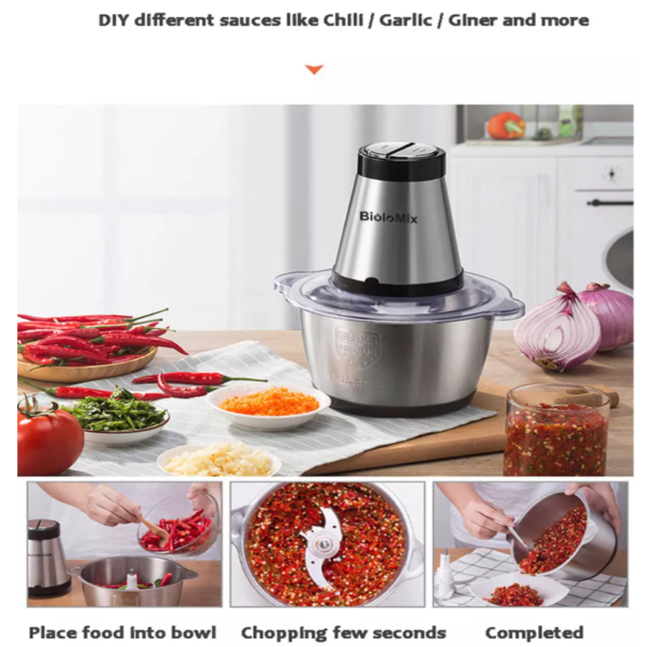 - Bạn có thể xay nhiều loại thực phẩm như: Xay thịt heo, thịt gia cầm, cá và các loại rau quả, gia vị như tỏi, ớt mà không lo mùi thực phẩm bám vào cối sau khi sử dụng. Thiết kế của máy xay thịt có thể dễ dàng tháo rời, vệ sinh và bảo quản. Cối xay mang sự sang trọng phù hợp đến cho không gian nhà bếp. Thông số kỹ thuật sản phẩm – Thương hiệu: BioloMix – Mã hàng: BC615 – Màu sắc: Bạc – Công suất: 500W – Điện áp: 220V – 240V