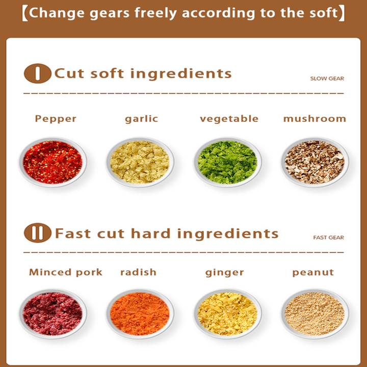 - Tốc độ I: Lưỡi dao quay chậm thích hợp xay các thực phẩm mềm: Rau củ, nấm, ớ