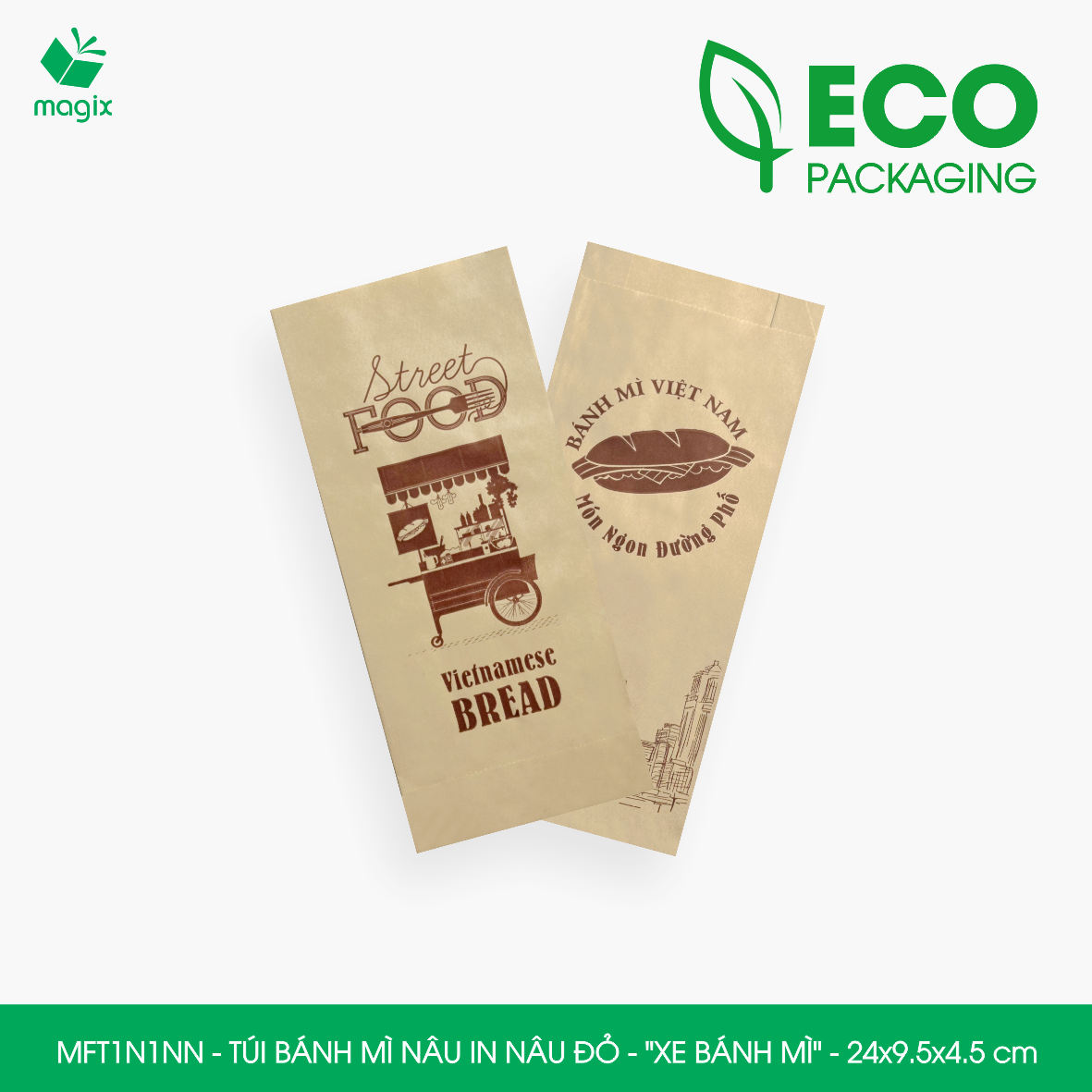 ĐẶC ĐIỂM SẢN PHẨM Chất liệu: Túi bánh mì in thường được làm từ giấy kraft nhật định lượng 50gsm thấm dầu có giấy chứng nhận FDA đảm bảo vệ sinh an toàn thực phầm Thiết kế: Miệng túi thiết kế chia thành 2 lớp dễ dàng thao tác bỏ bánh mì vào túi, đơn giản và tiện dụng    CÔNG DỤNG Tiện lợi: Bảo vệ bánh mì khỏi bụi bẩn, môi trường ô nhiễm, tác động từ bên ngoài và tránh làm dơ tay khi sử dụng Quảng cáo thương hiệu: Túi bánh mì in được sử dụng như một phương tiện quảng cáo nhỏ gọn và hiệu quả, với thiết kế in ấn logo, thông tin về sản phẩm và các thông điệp quảng cáo khác Bảo vệ môi trường: Túi bánh mì được làm từ chất liệu giấy kraft nguyên sinh, giúp giảm thiểu lượng rác thải nhựa và bảo vệ môi trường Tiết kiệm chi phí: Túi giấy bánh mì có giá thành thấp hơn so với các loại bao bì khác như hộp giấy, hộp nhựa đựng bánh mì   TIÊU CHUẨN KỸ THUẬT Chất liệu: Giấy Kraft chuyên dùng cho thực phẩm đạt tiêu chuẩn FDA  Định lượng: 50gsm Mã hàng - Kiểu in - Kích thước  • MFT1N5NN - Túi bánh mì nâu in nâu - "Giỏ bánh mì" - 24x9.5x4.5 cm  • MFT1T5N - Túi bánh mì trắng in nâu - "Giỏ bánh mì" - 24x9.5x4.5 cm  • MFT1N4X - Túi bánh mì nâu in xanh lá - "Best street food" - 24x9.5x4.5 cm  • MFT1T4X - Túi bánh mì trắng in xanh lá - "Best street food" - 24x9.5x4.5 cm  • MFT1N4NN - Túi bánh mì nâu in nâu đỏ - "Best street food" - 24x9.5x4.5 cm  • MFT1T4N - Túi bánh mì trắng in nâu - "Best street food" - 24x9.5x4.5 cm  • MFT1T3C - Túi bánh mì trắng in cam - "Đầu bếp" - 24x9.5x4.5 cm  • MFT1N3NN - Túi bánh mì nâu in nâu đỏ - "Đầu bếp" - 24x9.5x4.5 cm  • MFT1T3NN - Túi bánh mì trắng in nâu đỏ - "Đầu bếp" - 24x9.5x4.5 cm  • MFT1N2NN - Túi bánh mì nâu in nâu đỏ - "Cối xay gió" - 24x9.5x4.5 cm  • MFT1T2N - Túi bánh mì trắng in nâu - "Cối xay gió" - 24x9.5x4.5 cm  • MFT1N1NN - Túi bánh mì nâu in nâu đỏ - "Xe bánh mì" - 24x9.5x4.5 cm  • MFT1T1N - Túi bánh mì trắng in nâu - "Xe bánh mì" - 24x9.5x4.5 cm   LƯU Ý Bảo quản sản phẩm nơi khô ráo, sạch sẽ tránh tiếp xúc trực tiếp với ánh nắng mặt trời và nhiệt độ cao.
