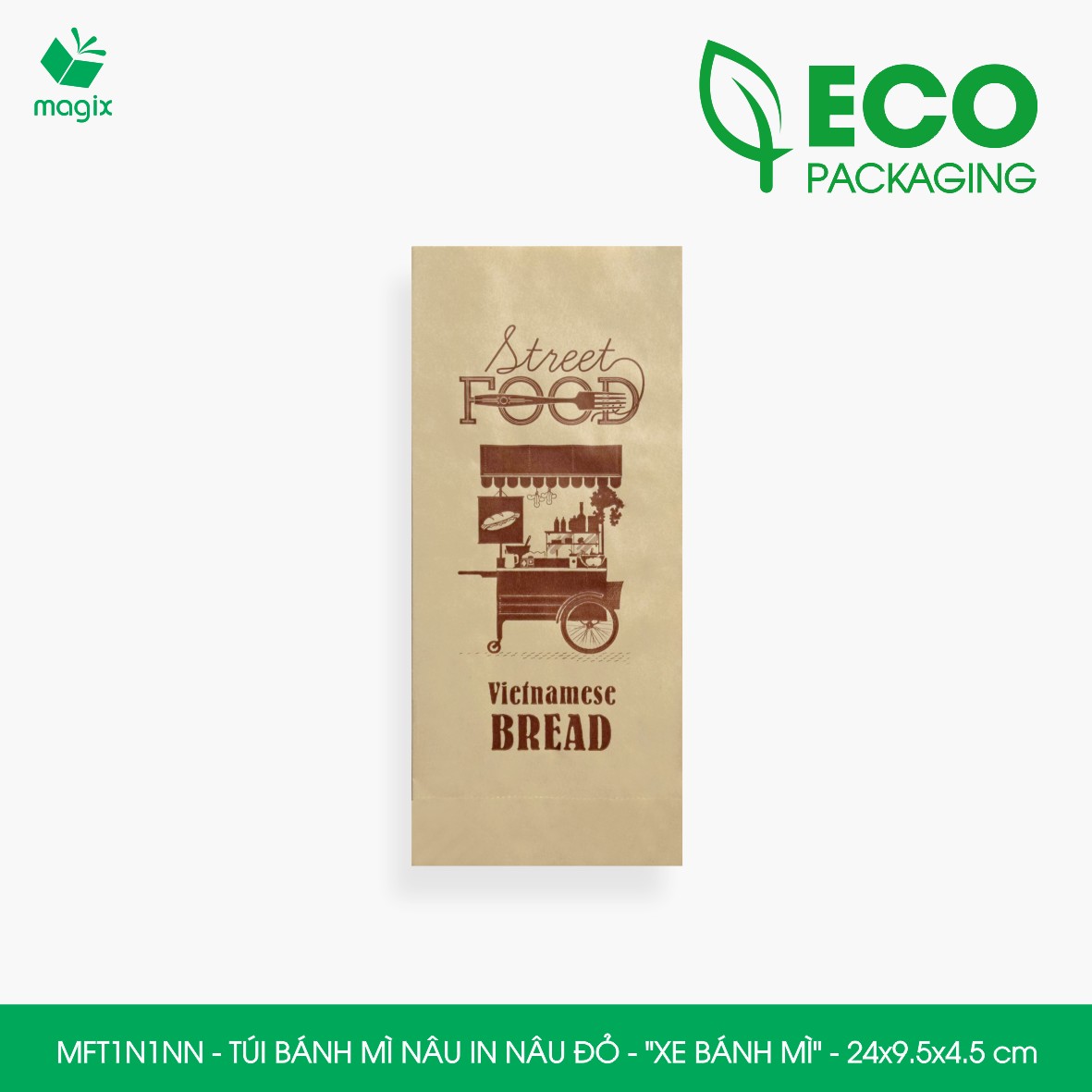• MFT1N4X - Túi bánh mì nâu in xanh lá - "Best street food" - 24x9.5x4.5 cm