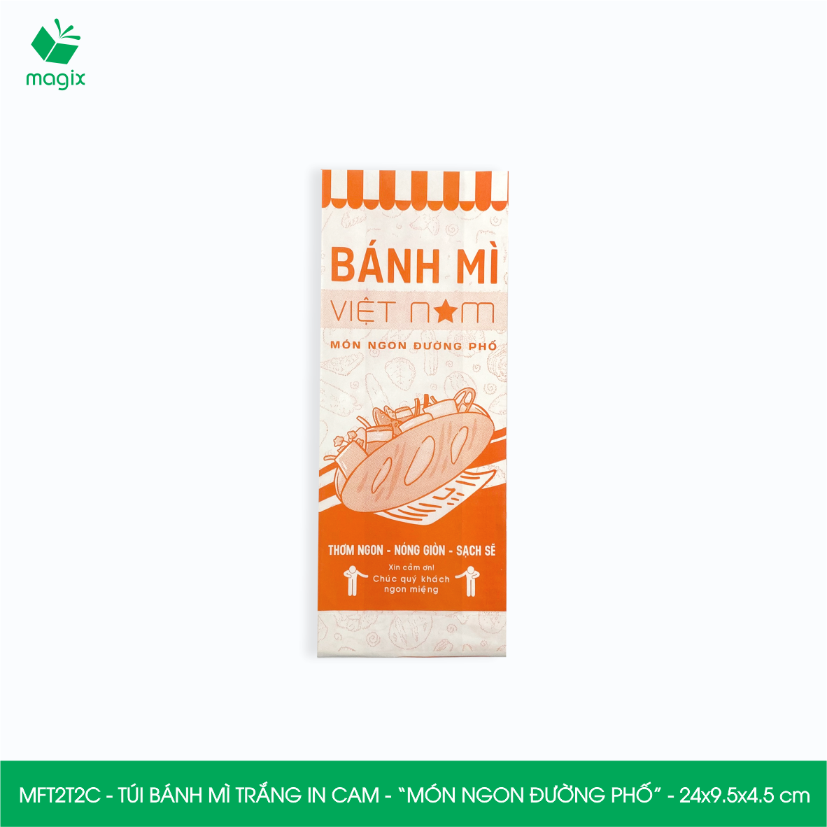 Túi đựng bánh mì truyền thống Việt Nam với thiết kế xếp hông, túi dán 3 biên có kích thước 24x9.5x4.5 cm. Chất lượng giấy đảm bảo vệ sinh an toàn thực phẩm, được nhiều cửa hàng, chuỗi bánh mì tin dùng sử dụng.    ƯU ĐIỂM Tiện lợi, đảm bảo vệ sinh an toàn thực phẩm: Thiết kế dạng túi mở vừa vặn ổ bánh mì. Sử dụng chất liệu giấy thấm dầu chuyên dành cho ngành công nghiệp thực phẩm giúp bảo vệ bánh mì khỏi ẩm mốc và giữ bánh tươi ngon lâu hơn. Tăng tính thẩm mỹ, chuyên nghiệp: Túi bánh mì in được sử dụng như một phương tiện quảng cáo nhỏ gọn và hiệu quả với thiết kế in ấn họa tiết đẹp mắt Thân thiện môi trường: Được làm từ giấy thực phẩm chất lượng cao, giúp giảm thiểu lượng rác thải nhựa và bảo vệ môi trường.   QUY CÁCH KỸ THUẬT  Kích thước: Xếp hông: 4.5 cm/ Cao: 24 cm/ Ngang: 9.5 cm Chất liệu: Giấy MG40 chuyên dùng cho thực phẩm đạt tiêu chuẩn FDA Mỹ Định lượng: 40gsm Mã sản phẩm - Kiểu in:  • MFT2T1C - Túi bánh mì trắng in cam - "Chả cá"   • MFT2T2C - Túi bánh mì trắng in cam - "Món ngon đường phố"  • MFT2T3C - Túi bánh mì trắng in cam - "Best street food"  • MFT2V4N - Túi bánh mì vàng in nâu - "Bông lúa"  • MFT2V5X - Túi bánh mì vàng in xanh - "Best street food"  • MFT2T6VD - Túi bánh mì trắng in vàng đỏ - "Premium quality"   • MFT2N7DD - Túi bánh mì nâu in đỏ đen - "Cô gái"   LƯU Ý Bảo quản sản phẩm nơi khô ráo, sạch sẽ tránh tiếp xúc trực tiếp với ánh nắng mặt trời và nhiệt độ cao.