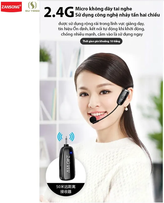 Mic không dây phát sóng 2.4G có thể xuyên tường Zansong V38 cho tất cả các loại loa có cổng mic, máy trợ giảng và nhiều loại khác. Microphone gài tai sử dụng công nghệ