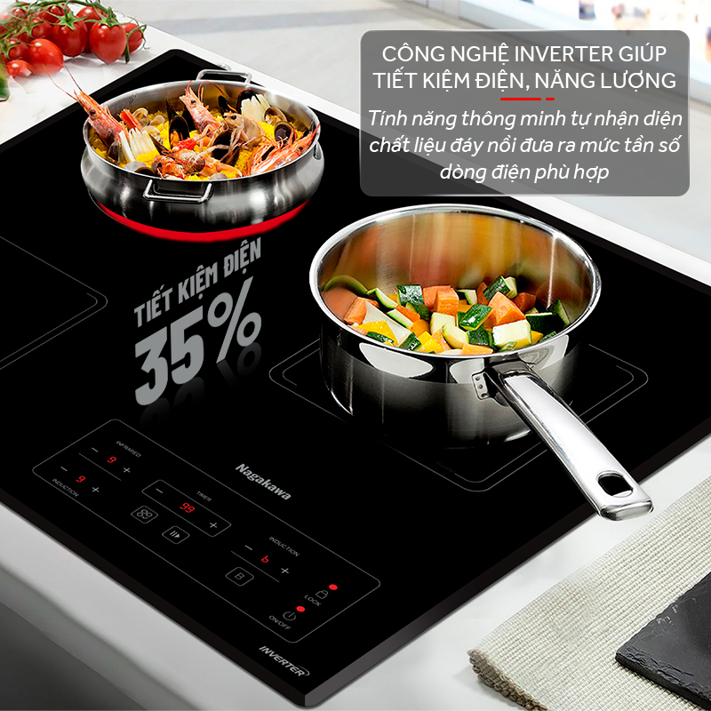 Bếp 3 lò điện từ hồng ngoại Nagakawa NAG1253M sử dụng công nghệ biến tần Inverter kiểm soát công suất của thiết bị, nhằm tránh hao phí năng lượng trong quá trình sử dụng. Nguyên tắc cơ bản của công nghệ Inverter là dựa trên kiểm soát từng tần số dao động (Hz) của các bảng mạch bên trong bếp, giúp đảm bảo độ ổn định của bếp, tiết kiệm tối đa năng lượng và gia tăng tính năng thông minh cho bếp.