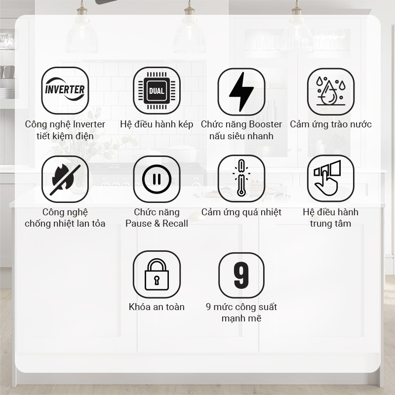 TÍNH NĂNG SẢN PHẨM Mặt kính Keramik nhập khẩu vát cạnh Điều khiển 9 mức công suất Chức năng iquick boiling nấu nhanh Chức năng tự động ngắt bếp khi nước tràn Vùng nấu bên