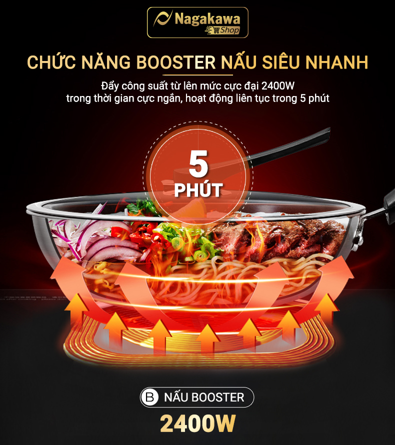Khi lựa chọn chức năng Booster, công suất bếp đôi điện từ hồng ngoại Nagakawa NAG1252M sẽ nhanh chóng được đẩy lên mức cực đại trong thời gian cực ngắn và hoạt động liên tục trong thời gian 5 phút, giúp rút ngắn tối đa thời gian đun nấu. Cụ thể, công suất bếp mặc định ở mức 1 là 400W, nếu chọn chức năng Booster, bếp nhanh chóng đạt công suất cực đại từ 2400W.