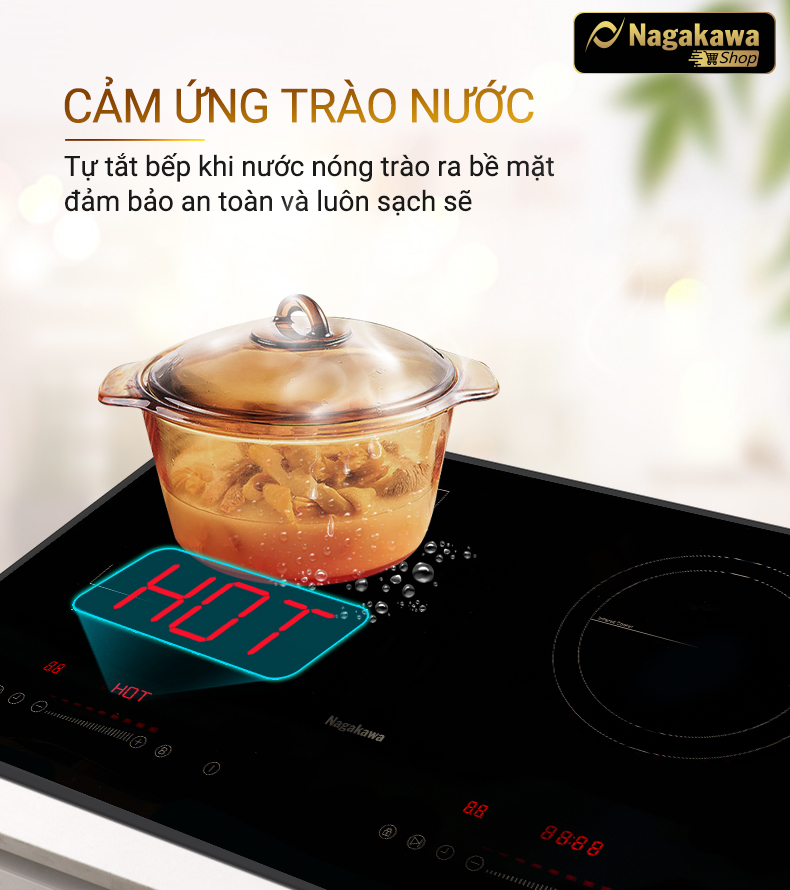 Chức năng chống quá nhiệt góp phần bảo vệ bếp đôi điện từ hồng ngoại Nagakawa NAG1252M, không cho phép sử dụng bếp khi nhiệt độ quá cao.