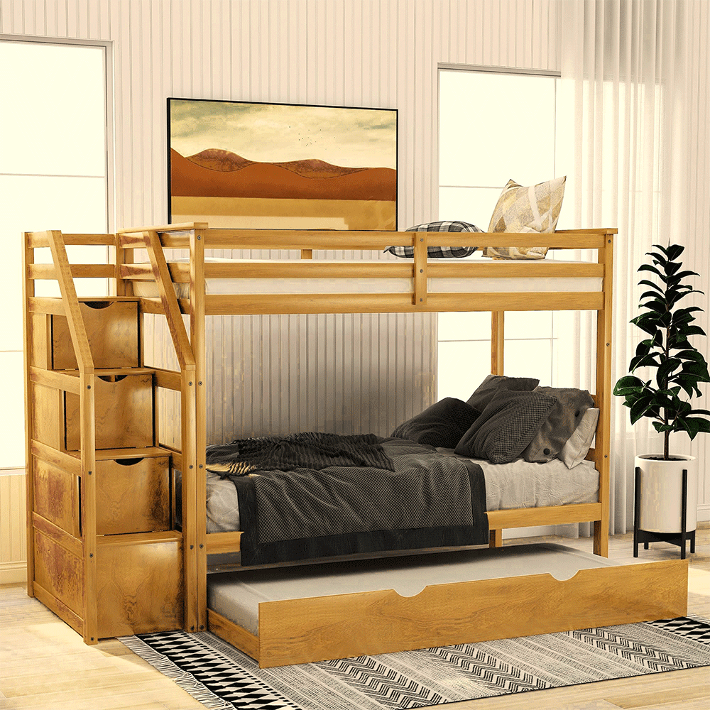 Giường tầng thang hộp XK Newport 1m/1m có kích thước lọt lòng giường trên/dưới là 100x193 cm, phủ bì 251x110x160 cm. Khoảng cách giữa 2 tầng là 97 cm, cầu thang hộp rộng 46cm có thể di động đặt bên phải hoặc bên trái tùy ý. Chân trụ dày 30x50 mm chịu lực. Thang giường được làm từ gỗ Plywood chắc chắn, dẻo dai với 13 thanh (cung sinh) bắt vít. Đặc biệt, các tầng được thiết kế tháo rời và có thể tách riêng thành 2 giường độc lập. Tùy nhu cầu, Quý khách có thể chọn loại chỉ giường để gầm thông thoáng, thêm ngăn kéo để đồ hay thêm giường kéo tăng chỗ ngủ. Kích thước DxRxC cả 2 hộc kéo là 95x11x40 cm, giường kéo là 100x185 cm. Giường tầng không chỉ giúp tiết kiệm không gian, mà còn là thế giới riêng của các bé. Giường tầng thang hộp XK Newport được thiết kế tối giản với 2 tầng có kích thước bằng nhau, thang rời tích hợp hộc đựng đồ tiện lợi. Khoảng cách giữa 2 tầng rộng rãi không sợ đụng đầu, kể cả với người lớn. Chất liệu gỗ thông xẻ sấy nhập khẩu được gia công tỉ mỉ, kết cấu chắc chắn, giúp các bé vui chơi an toàn và có những giấc ngủ ngon. Miễn phí lắp đặt tại TP.HCM, Bình Dương, Đồng Nai.