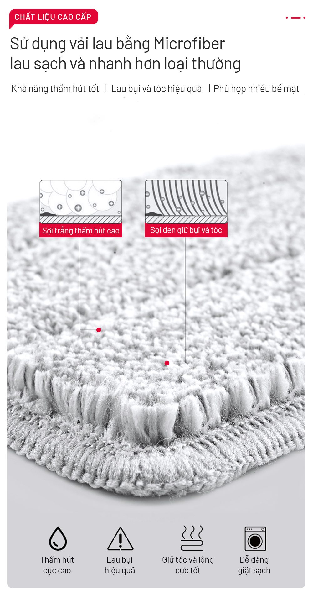 Vải lau được dệt từ sợi Microfiber cao cấp với các tính năng nổi bật như sau: + Vải lau phù hợp với lau các loại sàn: Gỗ, đá, Gạch Ceramic + Bắt bụi, +