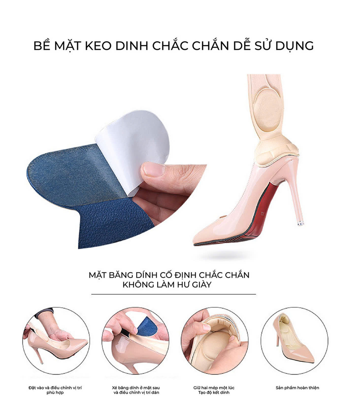 - Công dụng: miếng lót giúp giảm size giày bị rộng, chống trầy gót chân, giảm đau gang bàn chân và giảm thốn gót chân khi phải đi đứng trên giày cao gót hoặc khi mang giày bị rộng