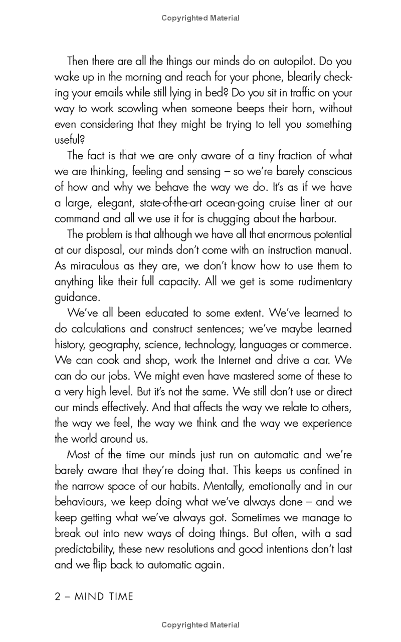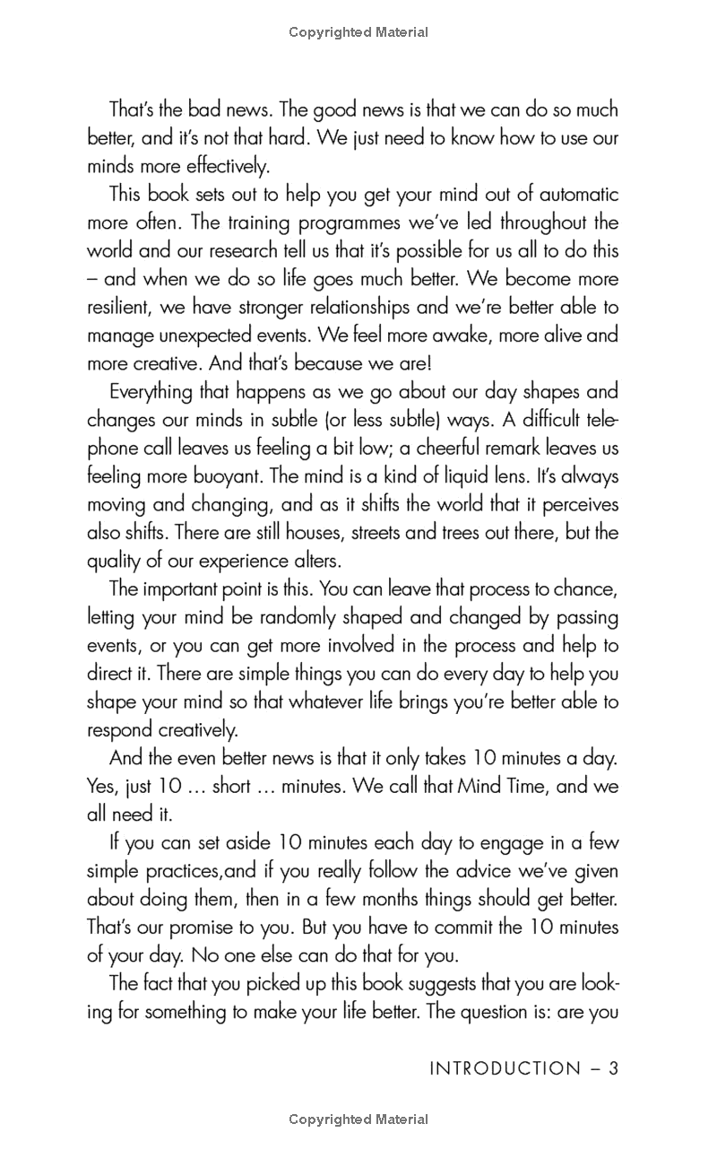 Mind Time contains simple, clear exercises that take only ten minutes per day and our research tells us that if you do these exercises, your life will change. The exercises build three core capacities – curiosity, self-awareness and acceptance. If you do them, and build these capacities, you will become less reactive and more responsive. This will lead to positive benefits in several key areas: your relationships, your ability to deal with unexpected events and your capacity to stay purposeful and to see your life as a matter of choices rather than seemingly impossible challenges.