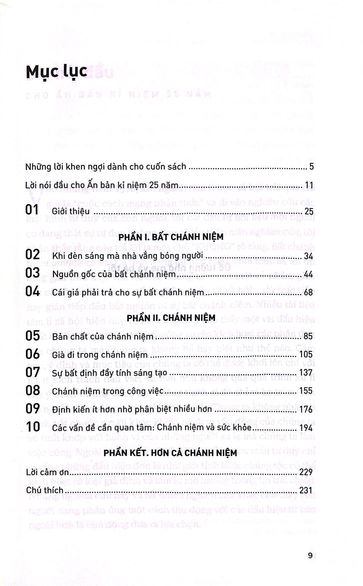 Mindfulness - Sống Tỉnh Thức Và Thực Hành Chánh Niệm Cuốn sách mang tính cách mạng cho thấy cách áp dụng chánh niệm vào mọi khía cạnh trong cuộc sống của chúng ta. Giải thích “chánh niệm” dưới góc nhìn của khoa học phương Tây, mang tới nhiều nghiên cứu mới về sự tác động giữa hành vi và ý thức của con người. Lý thuyết của Langer đã được áp dụng cho nhiều lĩnh vực, bao gồm sức khỏe, kinh doanh, lão hóa, công bằng xã hội và học tập. Nội dung chính: Chương 2 xem xét bản chất của bất chánh niệm và so sánh với các khái niệm tương tự như thói quen và vô thức. Chương 3 khám phá nguyên nhân của tình trạng bất chánh niệm, bao gồm vai trò quan trọng của bối cảnh và bản chất của những gì chúng ta tiếp nhận khi còn nhỏ. Tổng quan về cái giá phải trả cho sự bất chánh niệm, những giới hạn mà nó gây ra đối với các kĩ năng cũng như kì vọng và tiềm năng của chúng ta là nội dung của chương 4. Chương 5, thảo luận về bản chất của chánh niệm và so sánh với các khái niệm liên quan trong triết học phương Đông. Các chương từ 6 đến 10 trình bày về những ứng dụng của nghiên cứu chánh niệm trong năm khía cạnh lớn của cuộc sống thường ngày: quá trình lão hoá, sự sáng tạo, công việc, vấn đề định kiến và sức khỏe.