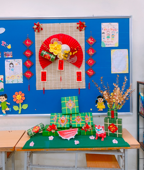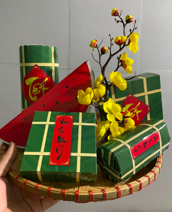 Mô hình bánh chưng, bánh tét, dưa dấu trang trí với chất liệu là giấy bìa cứng, in hình sắc nét.