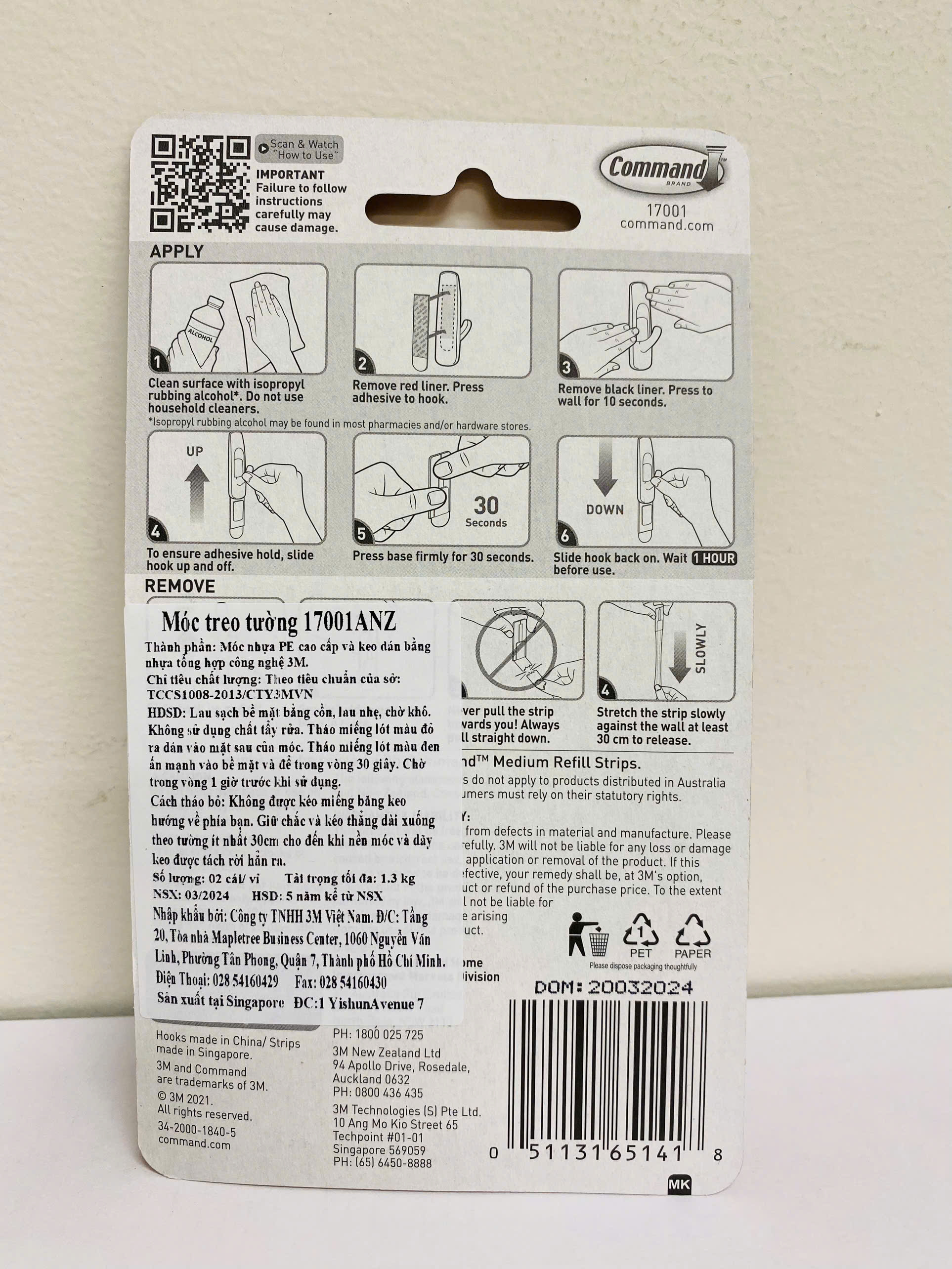 Móc dán tường kiểu vuông 3M COMMAND 17001ANZ, 1.3 kg, 2 cái/vỉ Nhãn hiệu Command là dòng sản phẩm nổi bật của tập đoàn 3M. Với mục tiêu bảo vệ bức tường của bạn, hạn