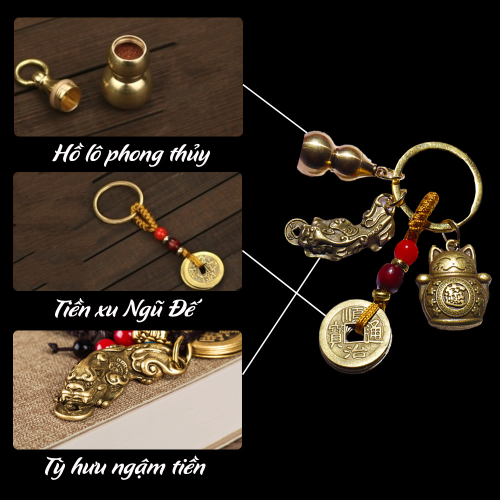Mua tại TiktokTHÔNG TIN SẢN PHẨM Chất liệu: Đồng Móc khóa tròn làm bằng thép Màu sắc: Đồng Trọng lượng cả bộ: 80gr CÔNG DỤNG Tiền xu Ngũ Đế: Giúp tăng cường vượng khí, phát triển tài lộc Hồ lô phong thủy và bột chu sa: Xua đuổi điều xui xẻo, tăng sức khỏe, hóa giải bệnh tật Tỳ hươu ngậm tiền: Giúp gia chủ phát tài, phát lộc cho việc kinh doanh, buôn bán trôi chảy. MẶT SAU đồng tiền là hình bát quái xua đuổi tà khí