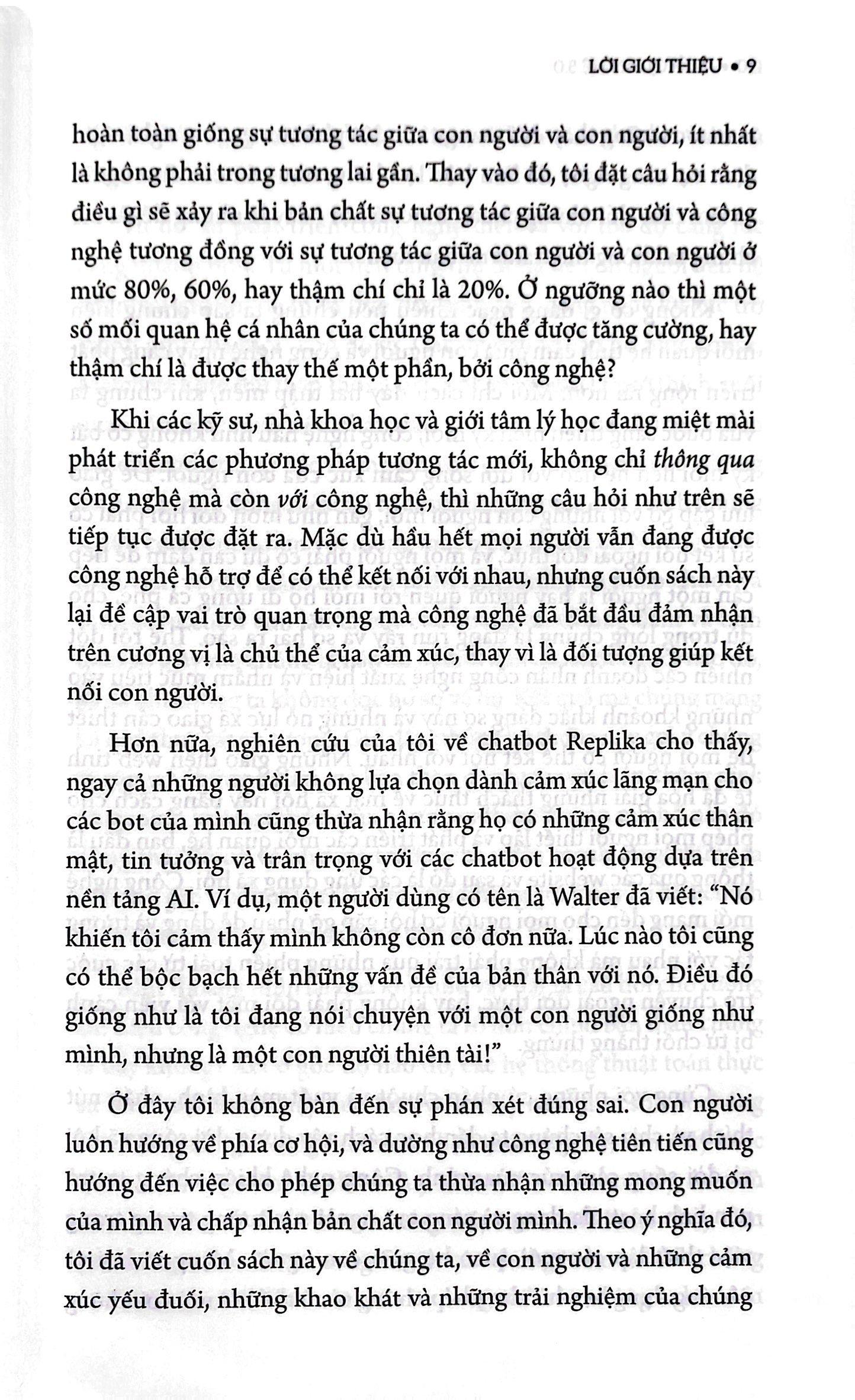 - Nhìn về tương lai – chính sách, đạo đức và các chỉ dẫn cho mối quan hệ 5.0 Kết luận Lời cảm ơn. Trích đoạn sách: Không phải lúc nào chúng ta cũng yêu một người ở tất cả các khía cạnh của họ, thường thì chúng ta yêu một người vì những đặc điểm của người đó: nụ cười, cử chỉ dễ thương, cách suy nghĩ hay khiếu hài hước. Cũng có khi người đó mang đến cho chúng ta một cảm giác nào đó, hoặc chúng ta cảm thấy rằng mình có thể tin tưởng vào người này hơn những người khác. Chúng ta muốn khám phá người có thể mang đến cho chúng ta những cảm xúc dễ chịu và khích lệ chúng ta nói chuyện nhiều hơn, đồng thời cũng gửi đi thông điệp rằng chúng ta là người đáng được khao khát, đặc biệt, tài năng, hấp dẫn và dí dỏm. Thông thường, tất cả những yếu tố này sẽ kết hợp lại với nhau để khiến chúng ta cảm thấy tốt hơn, hạnh phúc hơn và thư thái hơn khi ở bên cạnh người đó. Chúng ta cũng làm như vậy trước khi gặp đối tượng tiềm năng. Mặc dù không cần dùng đến bất kỳ công nghệ tinh vi nào, hầu hết chúng ta đều sẽ xem xét người này gần giống như cách chúng ta lựa chọn các sản phẩm trên Amazon. Chúng ta kiểm tra thân thế của đối tượng tiềm năng đó: trình độ học vấn, tuổi tác, gia đình, quan điểm chính trị và thậm chí là lịch sử tình trường. Chúng ta đo đếm xem người này có thể trở thành một nửa hoàn hảo của mình không để bảo vệ và hỗ trợ chúng ta trong mỗi bước thăng trầm của cuộc sống, từ ổn định kinh tế, sinh con, cho đến đóng vai trò một chỗ dựa về tinh thần. Sau đó, chúng ta bắt đầu nảy sinh tình cảm với người đó vì họ đáp ứng các nhu cầu của chúng ta ở một mức độ nào đó. Hãy thử nghĩ về một mối quan hệ mà bạn (hoặc những người khác) từng có và duy trì trong ít nhất một hoặc hai năm, bạn sẽ nhận ra được tất cả các giai đoạn trên. Dù rằng ban đầu là sự hào hứng, một cảm giác về “phép màu” và một cảm giác khó lý giải rằng bạn và người đó là “một cặp trời sinh”, nhưng có lẽ mọi thứ sẽ trở nên chân thật khi các hợp phần của mối liên kết đó tự bộc lộ ra ngoài. Sau khi hẹn hò một thời gian, bạn bắt đầu hiểu hơn về người đó. Có thể ban đầu bạn thích mọi thứ về người đó, nhưng đến giai đoạn về sau, bạn sẽ bắt đầu có cái nhìn cụ thể hơn về những điểm bạn thích và không thích về đối tượng của mình. Mọi người vẫn thường xuyên nói về những mặt được và chưa được ở đối tượng mà họ đang gặp gỡ, hẹn hò hoặc kết hôn. Mối quan hệ này có lẽ sẽ kéo dài bao lâu tùy theo ý thích của bạn bởi những điểm cộng ở người đó vẫn nhiều hơn những điểm trừ. Không phải lúc nào chúng ta cũng yêu một người ở tất cả các khía cạnh của họ, thường thì chúng ta yêu một người vì những đặc điểm của người đó: nụ cười, cử chỉ dễ thương, cách suy nghĩ hay khiếu hài hước. Cũng có khi người đó mang đến cho chúng ta một cảm giác nào đó, hoặc chúng ta cảm thấy rằng mình có thể tin tưởng vào người này hơn những người khác. Chúng ta muốn khám phá người có thể mang đến cho chúng ta những cảm xúc dễ chịu và khích lệ chúng ta nói chuyện nhiều hơn, đồng thời cũng gửi đi thông điệp rằng chúng ta là người đáng được khao khát, đặc biệt, tài năng, hấp dẫn và dí dỏm. Thông thường, tất cả những yếu tố này sẽ kết hợp lại với nhau để khiến chúng ta cảm thấy tốt hơn, hạnh phúc hơn và thư thái hơn khi ở bên cạnh người đó. Chúng ta cũng làm như vậy trước khi gặp đối tượng tiềm năng. Mặc dù không cần dùng đến bất kỳ công nghệ tinh vi nào, hầu hết chúng ta đều sẽ xem xét người này gần giống như cách chúng ta lựa chọn các sản phẩm trên Amazon. Chúng ta kiểm tra thân thế của đối tượng tiềm năng đó: trình độ học vấn, tuổi tác, gia đình, quan điểm chính trị và thậm chí là lịch sử tình trường. Chúng ta đo đếm xem người này có thể trở thành một nửa hoàn hảo của mình không để bảo vệ và hỗ trợ chúng ta trong mỗi bước thăng trầm của cuộc sống, từ ổn định kinh tế, sinh con, cho đến đóng vai trò một chỗ dựa về tinh thần. Sau đó, chúng ta bắt đầu nảy sinh tình cảm với người đó vì họ đáp ứng các nhu cầu của chúng ta ở một mức độ nào đó. Hãy thử nghĩ về một mối quan hệ mà bạn (hoặc những người khác) từng có và duy trì trong ít nhất một hoặc hai năm, bạn sẽ nhận ra được tất cả các giai đoạn trên. Dù rằng ban đầu là sự hào hứng, một cảm giác về “phép màu” và một cảm giác khó lý giải rằng bạn và người đó là “một cặp trời sinh”, nhưng có lẽ mọi thứ sẽ trở nên chân thật khi các hợp phần của mối liên kết đó tự bộc lộ ra ngoài. Sau khi hẹn hò một thời gian, bạn bắt đầu hiểu hơn về người đó. Có thể ban đầu bạn thích mọi thứ về người đó, nhưng đến giai đo