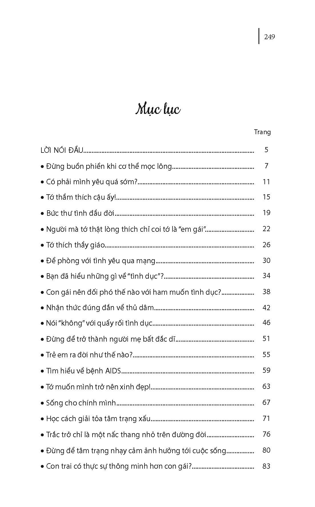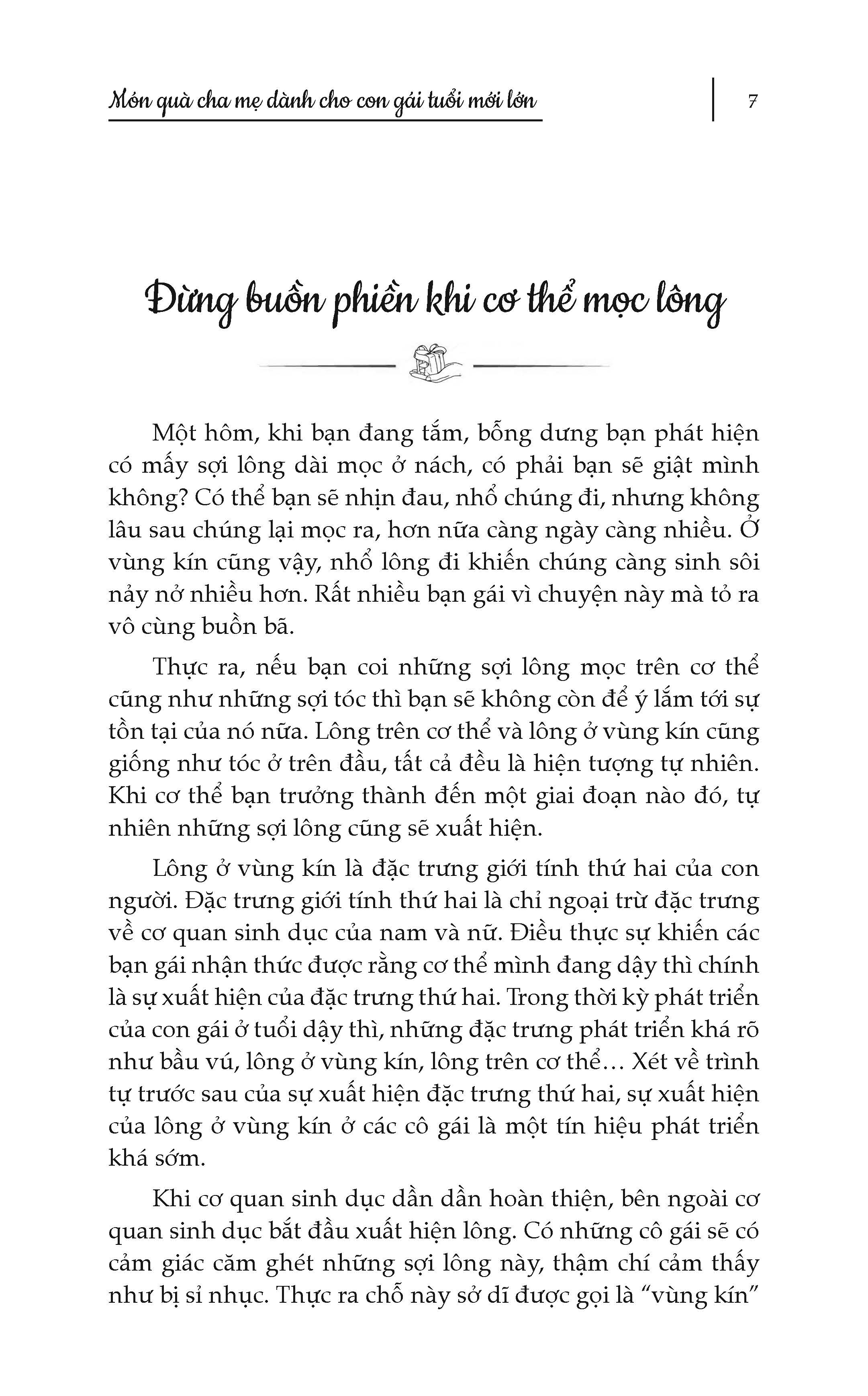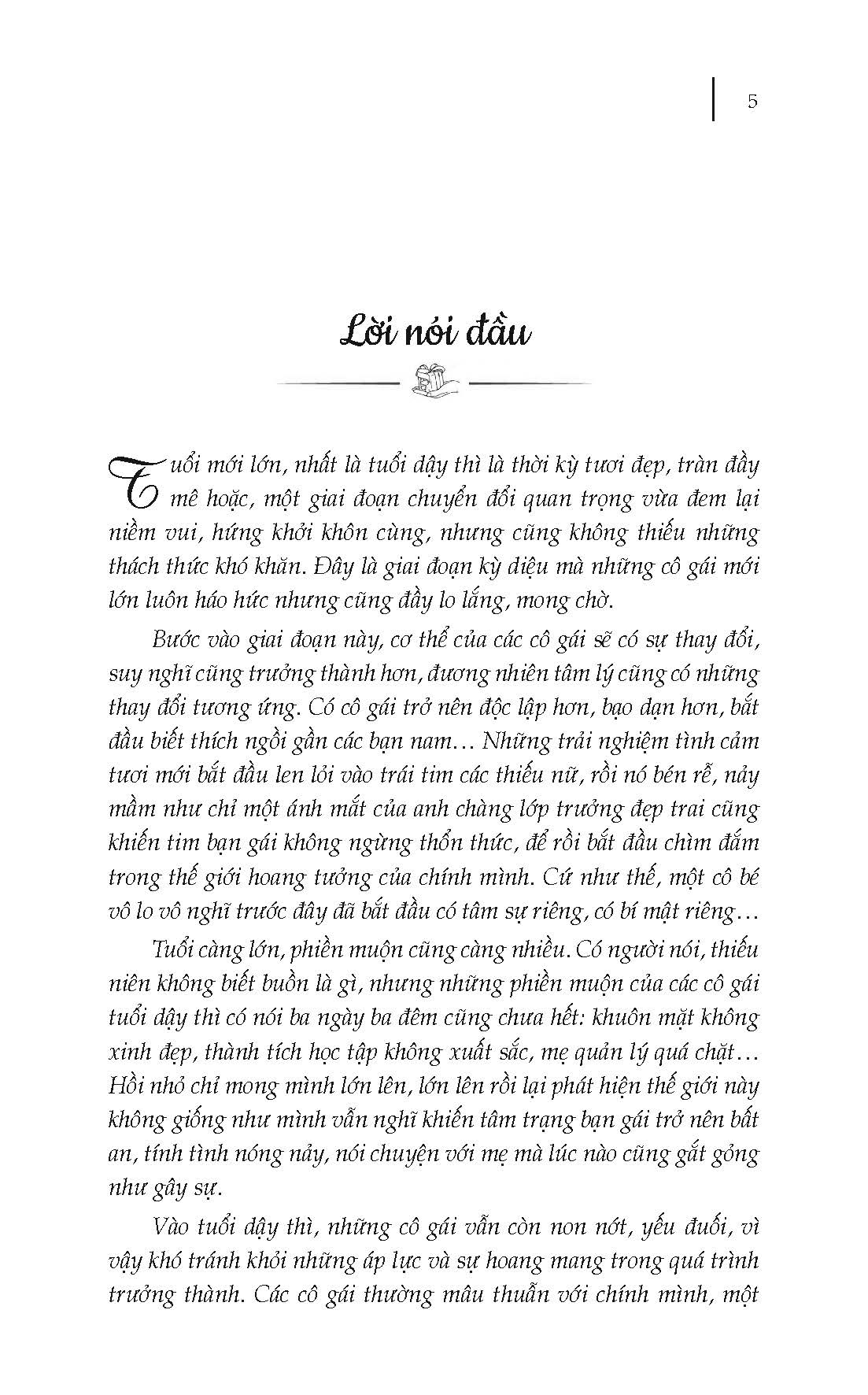 Mua tại TiktokMột cuốn cẩm nang hữu ích mà các bậc cha mẹ dành cho con gái tuổi mới lớn, cung cấp những kiến thức cơ bản, thiết thực nhất cùng những giải đáp các thắc mắc về tâm sinh lý, những vấn đề tế nhị mà các bạn nữ tuổi dậy thì thường gặp phải nhưng lại không dễ gì hỏi hay trao đổi trực tiếp với cha mẹ hay người khác, giúp các bạn vững vàng bước vào cuộc sống.