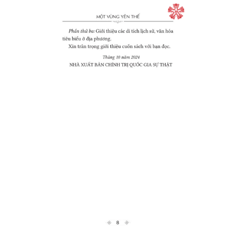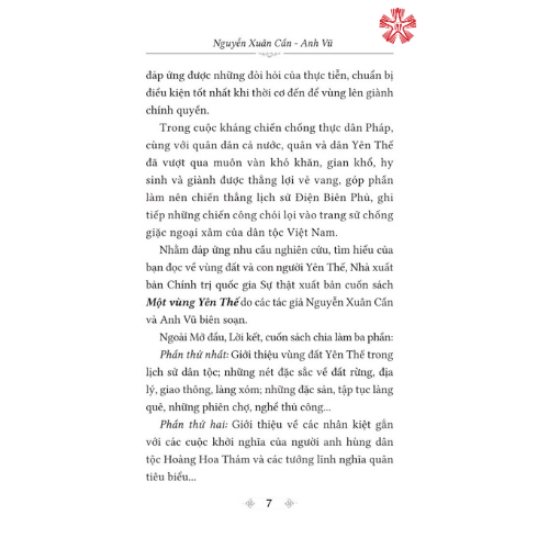 Mua tại TiktokNhằm đáp ứng nhu cầu nghiên cứu, tìm hiểu của bạn đọc về vùng đất và con người Yên Thế, Nhà xuất bản Chính trị quốc gia Sự thật xuất bản cuốn sách Một vùng Yên Thế do các tác giả Nguyễn Xuân Cần và Anh Vũ biên soạn. Ngoài Mở đầu, Lời kết, cuốn sách chia làm ba phần: Phần thứ nhất: Giới thiệu vùng đất Yên Thế trong lịch sử dân tộc; những nét đặc sắc về đất rừng, địa lý, giao thông, làng xóm; những đặc sản, tập tục làng quê, những phiên chợ, nghề thủ công... Phần thứ hai: Giới thiệu về các nhân kiệt gắn với các cuộc khởi nghĩa của người anh hùng dân tộc Hoàng Hoa Thám và các tướng lĩnh nghĩa quân tiêu biểu... Phần thứ ba: Giới thiệu các di tích lịch sử, văn hóa tiêu biểu ở địa phương.