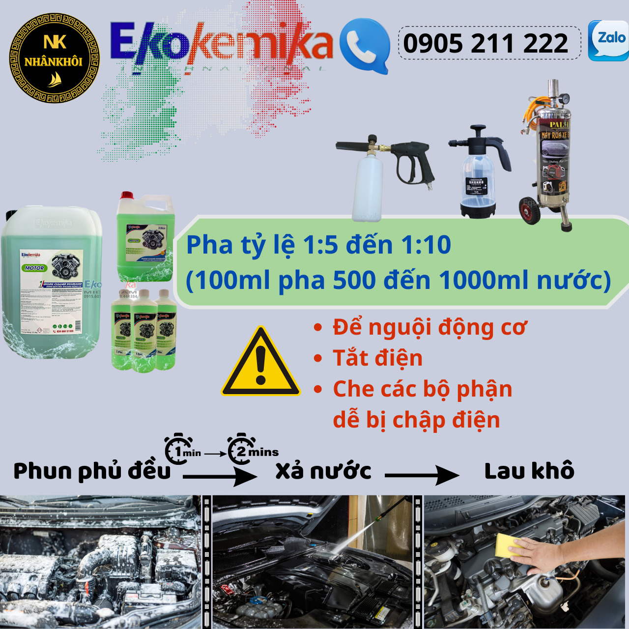 Dung dịch Motor - Ekokemika tạo ra loại bọt hoạt tính loại bỏ 95% bụi bẩn, dầu và chất tĩnh điện trên khoang động cơ xe, trong điều kiện sử dụng thông thường không ảnh hưởng đến sơn xe và các bề mặt mạ crom, hương thơm dễ chịu. Phù hợp với nước cứng.