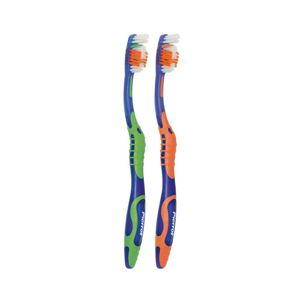 Bộ 2 bàn chải đánh răng Pierrot vàng siêu mềm với đầu lông chải xiên linh hoạt có khả năng làm sạch sâu tận kẽ chân răng. Bàn chải có kèm dụng cụ làm sạch