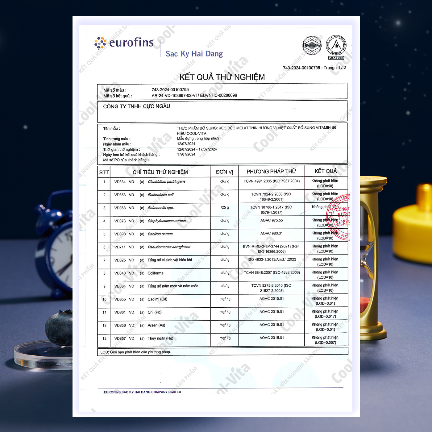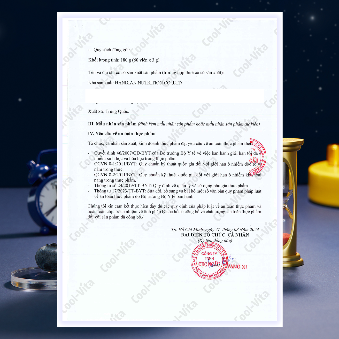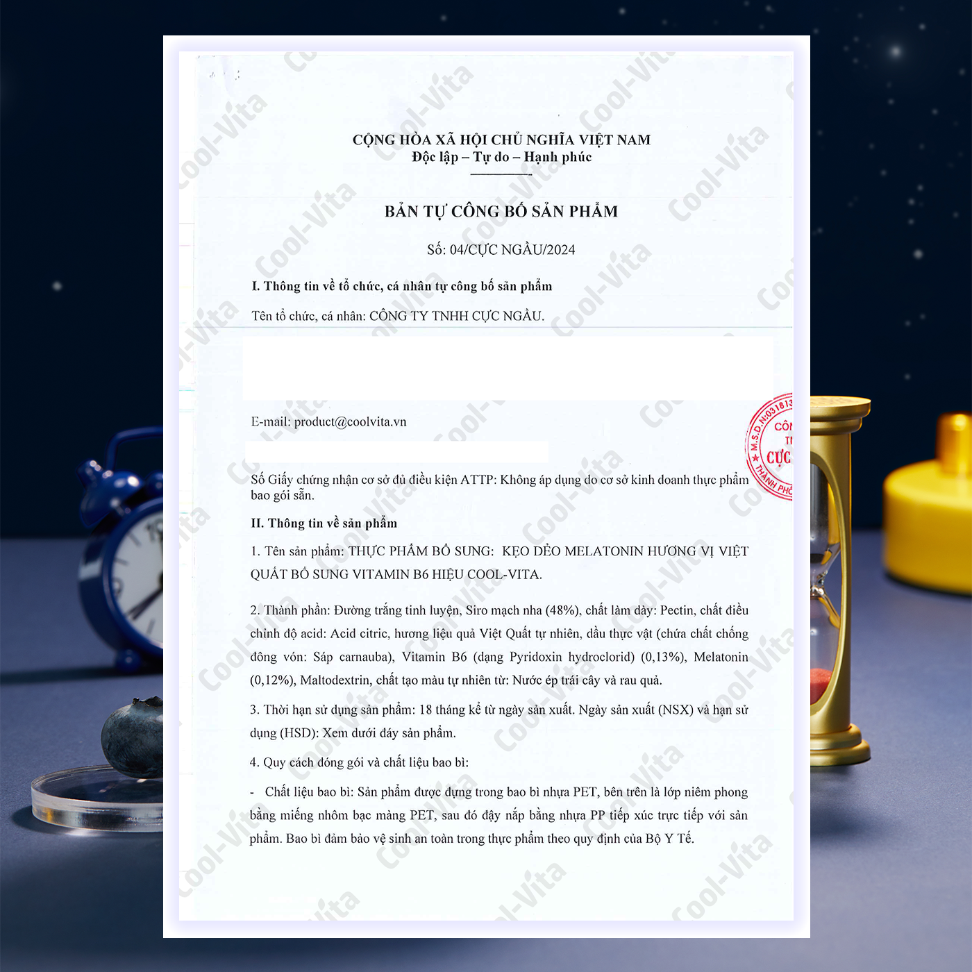 - (Tặng) 1 Hộp Nước Uống Collagen Cao Cấp Cool-Vita 3000mg Collagen Peptide (45ml× 7 túi)/hộp Bạn đang gặp khó khăn khi đi vào giấc ngủ? Vậy thì đừng nên bỏ qua Kẹo Dẻo Melatonin Vị Việt Quất của CoolVita! Kẹo Dẻo Melatonin CoolVita Vị Việt Quất Kết Hợp Vitamin B6 hỗ trợ điều chỉnh chu kỳ giấc ngủ và hỗ trợ cải thiện chất lượng giấc ngủ ngon hơn. Với 6mg melatonin trong mỗi 2 viên kẹo, kết hợp cùng vitamin B6 hỗ trợ giảm căng thẳng, có một đêm ngủ ngon và sâu hơn. Công dụng nổi bật: Hỗ trợ cải thiện chất lượng giấc ngủ: Mỗi 2 viên kẹo dẻo chứa 6mg Melatonin kết hợp Vitamin B6 hỗ trợ điều chỉnh chu kỳ giấc ngủ tự nhiên, giúp bạn dễ dàng đi vào giấc ngủ và duy trì giấc ngủ sâu suốt đêm. Hỗ trợ giúp thư giãn trước khi ngủ: Vitamin B6 giúp tạo cảm giác thư giãn trước khi ngủ, giúp cơ thể dễ dàng đi vào giấc ngủ. An toàn và lành mạnh: Kẹo Dẻo Melatonin CoolVita không phải là thuốc ngủ, hỗ trợ bạn ngủ ngon hơn. Nguyên liệu từ thực vật: Được làm bằng pectin từ thực vật thay vì gelatin, sản phẩm an toàn cho sức khỏe và phù hợp với chế độ ăn chay. Đặc điểm sản phẩm: Hương vị thơm ngon: Vị việt quất chua ngọt dễ chịu, kẹo dẻo mềm mịn, ngon miệng, không gây dính răng. Dễ sử dụng: Sản phẩm được chế biến thành dạng kẹo dẻo nhai tiện lợi. Tiện lợi mang theo: Hộp nhựa nhỏ gọn, dễ dàng mang theo khi đi công tác hoặc du lịch. Thành phần: Đường trắng tinh luyện, Siro mạch nha (48%), chất làm dày (Pectin), chất điều chỉnh độ acid: Acid citric, hương liệu quả việt quất tự nhiên, dầu thực vật (chứa chất chống đông vón: Sáp carnauba), Vitamin B6 (dạng Pyridoxin hydrochloric 0,13%), Melatonin (0,12%), Maltodextrin, chất tạo màu tự nhiên. Nước ép trái cây và rau quả. Khối lượng tịnh: 180g (60 viên x 3g) Hướng dẫn sử dụng: