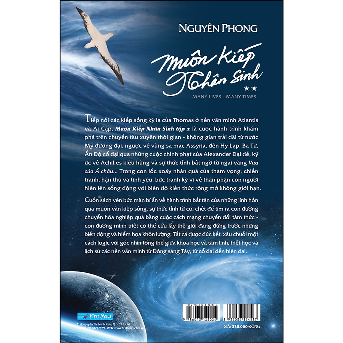 Muôn Kiếp Nhân Sinh 2 Khổ lớn (Bìa Cứng)------------ CUỐN SÁCH CỦA NHỮNG CÁNH BƯỚM RUNG ĐỘNG Tác phẩm Muôn Kiếp Nhân Sinh tập 1 của tác giả Nguyên Phong xuất bản giữa tâm điểm của đại dịch đã thực sự tạo nên một hiện tượng xuất bản hiếm có ở Việt Nam. Cuốn sách đã khơi dậy những trực cảm tiềm ẩn của con người, làm thay đổi góc nhìn cuộc sống và thức tỉnh nhận thức của chúng ta giữa một thế giới đang ngày càng bất ổn và đầy biến động. Ngoài việc phát hành hơn 200.000 bản trong 6 tháng, chưa kể lượng phát hành Ebook và Audio Book qua Voiz-FM, First News còn nhận được hàng ngàn tin nhắn, e-mail chuyển lời cảm ơn đến tác giả Nguyên Phong. Điều này chứng tỏ sức lan tỏa của cuốn sách đã tạo nên một hiện tượng trong văn hóa đọc của năm 2020. Khởi duyên cuốn sách Muôn Kiếp Nhân Sinh là cuộc điện thoại lúc đêm khuya từ Việt Nam qua Mỹ vào cuối năm 2016. Khi cảm nhận thế giới xung quanh còn quá nhiều áp bức, bất công và điều ác đang diễn ra, tôi đã đề nghị tác giả Nguyên Phong viết một cuốn sách về Nhân quả để cảnh báo và thức tỉnh con người (tác phẩm Hành Trình về Phương Đông do ông viết phóng tác gần năm mươi năm trước đã làm nhiều thế hệ người Việt Nam thay đổi tâm thức và được yêu thích cho đến giờ). Lúc đó, tác giả Nguyên Phong đã kể tôi nghe về câu chuyện nhân quả và tiền kiếp đặc biệt kỳ lạ của Thomas - một doanh nhân thành đạt ở New York và cũng là người bạn tâm giao mà ông đã từng gặp ở Đại học Đài Bắc năm 2008. Sau cuộc điện thoại đêm khuya đó, ông đã lẳng lặng bay đến New York gặp Thomas và đề nghị được viết những câu chuyện lạ thường của Thomas thành sách. Và bất ngờ - Thomas đã đồng ý. Muôn Kiếp Nhân Sinh đã ra đời một cách kỳ lạ như cuốn sách của nhân duyên và có một sứ mệnh đặc biệt. Tôi và nhiều độc giả Việt Nam đã thực sự lay động và đồng cảm sâu sắc với những lời chia sẻ tâm huyết của Thomas ở những trang sách cuối tập 1: “Tôi mong chúng ta - những cánh bướm bé nhỏ rung động mong manh - cũng có thể tạo nên những trận cuồng phong mãnh liệt để thức tỉnh mọi người”. Tiếp nối các kiếp sống kỳ lạ của Thomas ở nền văn minh Atlantis và Ai Cập hùng mạnh ở tập 1, Muôn Kiếp Nhân Sinh tập 2 là cuộc hành trình vô tiền khoáng hậu tiếp theo của Thomas trên chuyến tàu xuyên thời gian - không gian trải dài từ nước Mỹ đương đại, ngược về vùng sa mạc Lưỡng Hà Assyria cho đến Hy Lạp, Ba Tư, Ấn Độ cổ đại qua những cuộc chinh phạt của Alexander Đại đế. Những ký ức về chiến binh kiêu hùng Achilles trong trận công thành Troy huyền thoại và sự thức tỉnh bất ngờ của vị đại đế bất bại khi chinh phục quốc gia huyền bí đã vẽ nên bức tranh kỳ vĩ về thân phận con người luôn phải xoay vần không ngừng trong bão tố Nhân quả của tham vọng, chiến tranh, hận thù và tình yêu trong suốt chiều dài lịch sử thế giới. Không chỉ là những bài học sâu sắc về Nhân quả của Thomas, Muôn Kiếp Nhân Sinh tập 2 còn vén bức màn bí ẩn và khám phá hành trình bất tận của những linh hồn qua các tầng cõi, trạm trung chuyển trong muôn vàn kiếp số Tất cả được đúc kết, xâu chuỗi lại một cách logic bằng góc nhìn hài hòa giữa tâm linh, khoa học, triết học và lịch sử các nền văn minh từ Đông sang Tây, từ cổ đại đến hiện đại. Thông qua những cuộc trò chuyện đầy tính minh triết, tác phẩm Muôn Kiếp Nhân Sinh tập 2 cũng đưa ra cách chuyển hóa nghiệp quả, đồng thời cảnh báo về những hiểm họa, biến động lớn trong tương lai của nhân loại cũng như gửi gắm những thông điệp chữa lành. Đây sẽ là khởi đầu một kỷ nguyên mới với cuộc cách mạng chuyển đổi tâm thức và cũng là con đường minh triết nhất để thức tỉnh, cứu mỗi người, cứu lấy sự sống trái đất đang bên bờ của những khủng hoảng, hiểm họa khó lường. Các nhà hiền triết đã chỉ rõ quá trình thức tỉnh bắt đầu từ chính mỗi người. Và đó sẽ không phải là hành trình vô vọng nếu chúng ta cùng thật sự ý thức được ý nghĩa sống và sứ mệnh của mình. Tương lai chúng ta có trở nên tốt đẹp hơn hay không là do năng lượng từ chính những suy nghĩ, hành động của chúng ta ngày hôm nay. Khi tâm huyết viết Muôn Kiếp Nhân Sinh, tác giả Nguyên Phong mong muốn truyền tải những thông điệp thức tỉnh cùng những lời cảnh báo đầy trách nhiệm với một trái tim giàu lòng trắc ẩn, yêu thương để mọi người cùng nhận thức, chuyển đổi - như những cánh bướm rung động mãnh liệt lan tỏa đến với nhiều người. Bởi tận cùng của những rung động lan tỏa đó sẽ tạo ra sự chuyển đổi tâm thức để tạo nên một tương lai tốt đẹp hơn cho mỗi người và cho nhân loại. Ngoài ra không còn bất kỳ lý do nào khác. Bôn ba muôn nẻo nhân sinh. Không ai mang theo được thứ gì khi rời xa thế giới này - trừ công và tội. Chính b