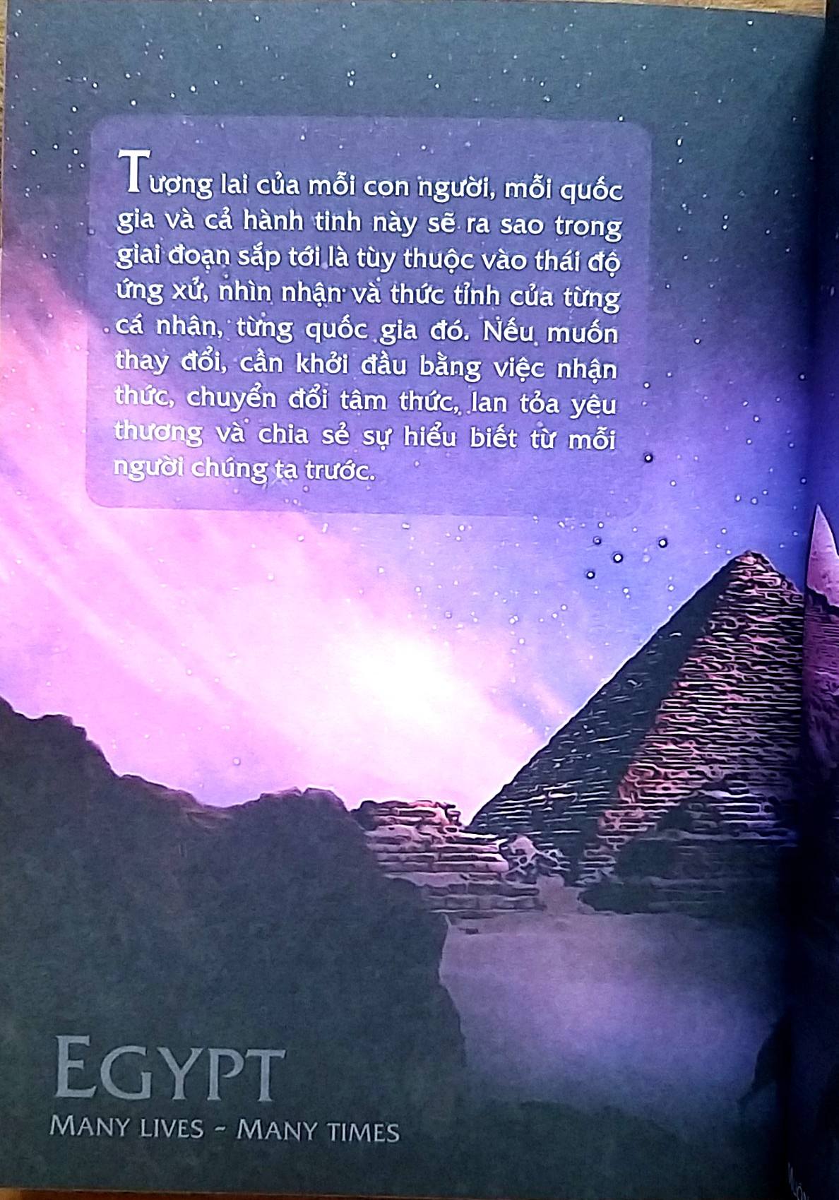 Tương lai của mỗi con người, mỗi tổ chức, mỗi quốc gia và cả hành tinh này sẽ ra sao trong giai đoạn sắp tới là tùy thuộc vào thái độ ứng xử, nhìn nhận và thức tỉnh của từng cá nhân, từng tổ chức, từng quốc gia đó tạo nên. Nếu muốn thay đổi, cần khởi đầu bằng việc nhận thức, chuyển đổi tâm thức, lan tỏa yêu thương và chia sẻ sự hiểu biết từ mỗi người chúng ta trước.