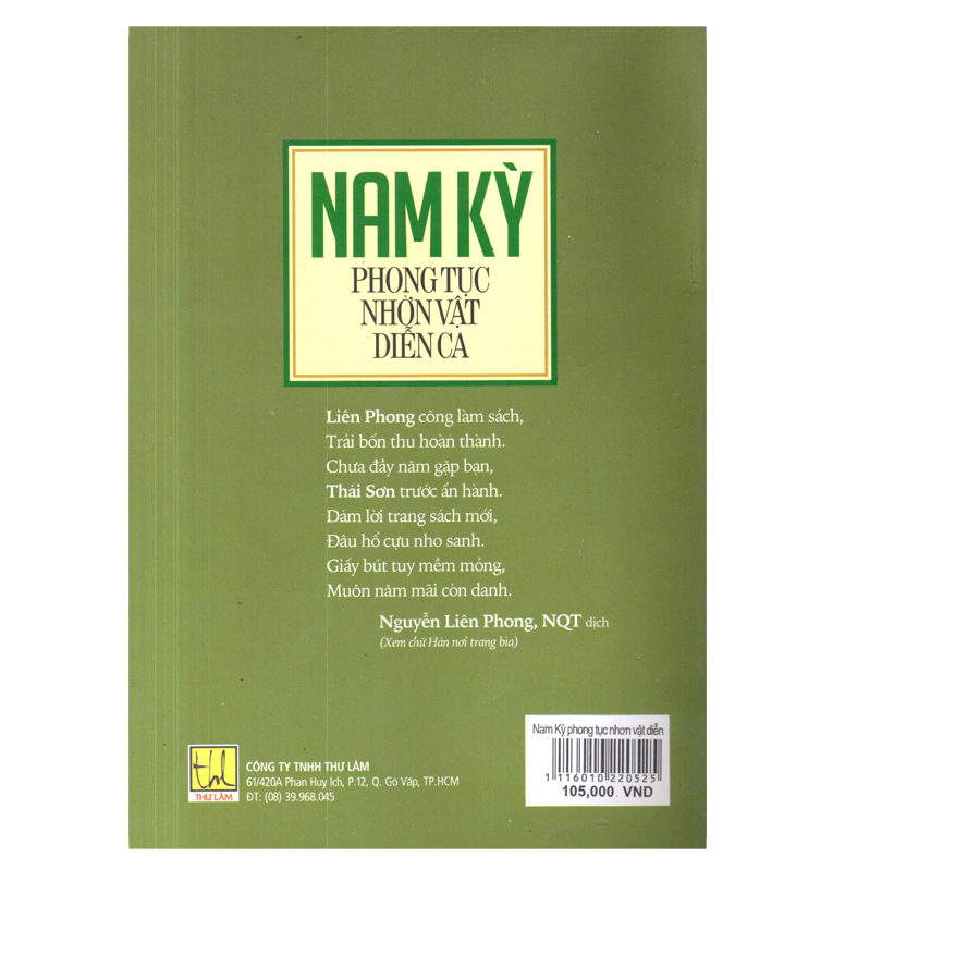 Mua tại TiktokNhóm tác giả cuốn sách giới thiệu: “Gần một thập kỷ sau Gia Định thành thông chí của Trịnh Hoài Đức năm 1821, Nam Kỳ phong tục nhơn vật diễn ca của Nguyễn Liên Phong năm 1909 đã xuất hiện như quyển địa phương chí Nam Bộ quan trọng thứ hai của người Việt. Trong hoàn cảnh giao thời từ xã hội phong kiến chuyển qua xã hội thuộc địa với tất cả tủi nhục và đắng cay của người dân mất nước, con người vẫn kịp có một quyển địa phương chí phản ánh khá trung thực và thể hiện khá chính xác không những về sinh hoạt xã hội mà còn về nguyện vọng văn hóa, không những về xu thế phát triển mà còn về hiểm họa lịch sử của mình…”.