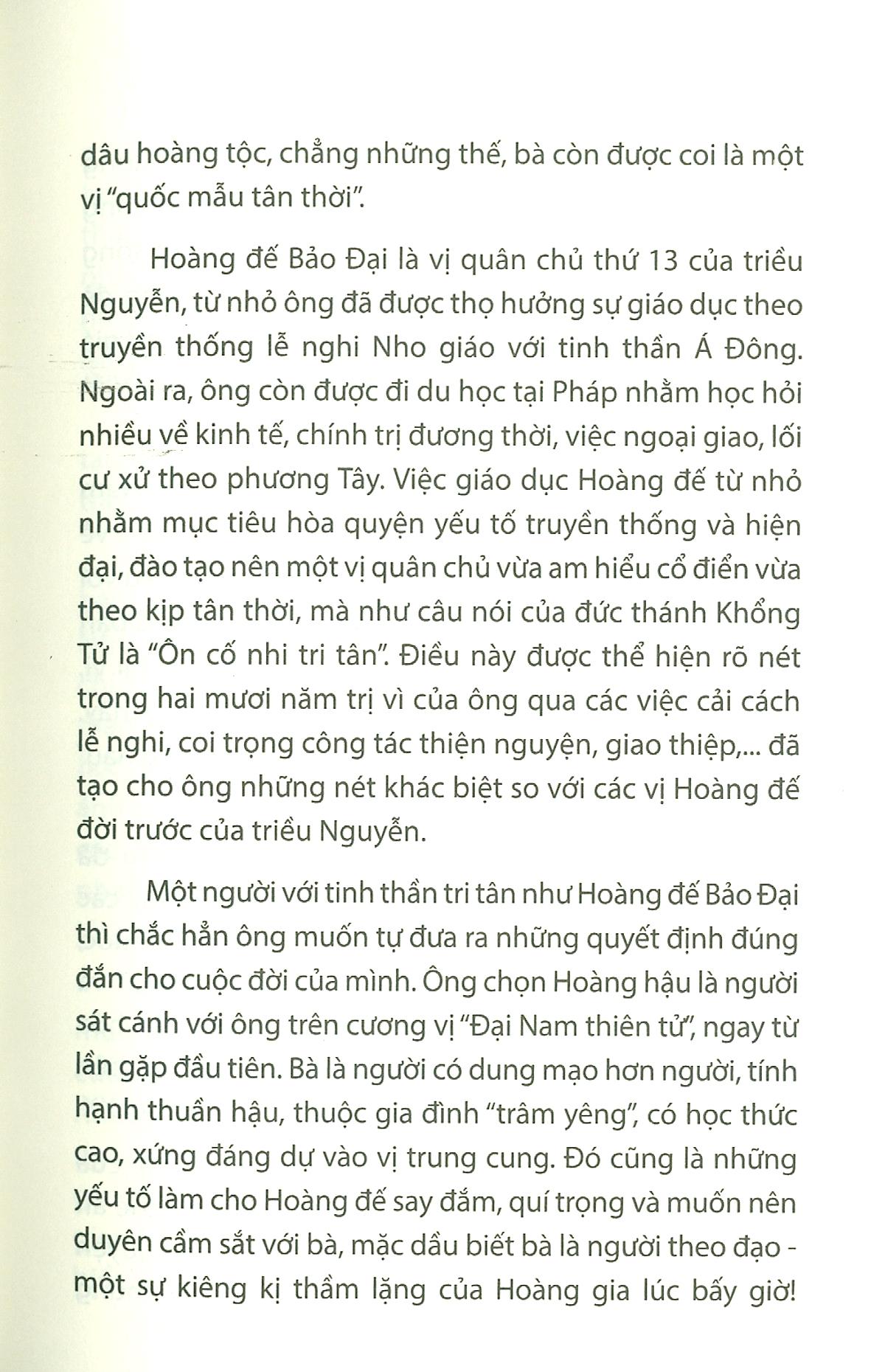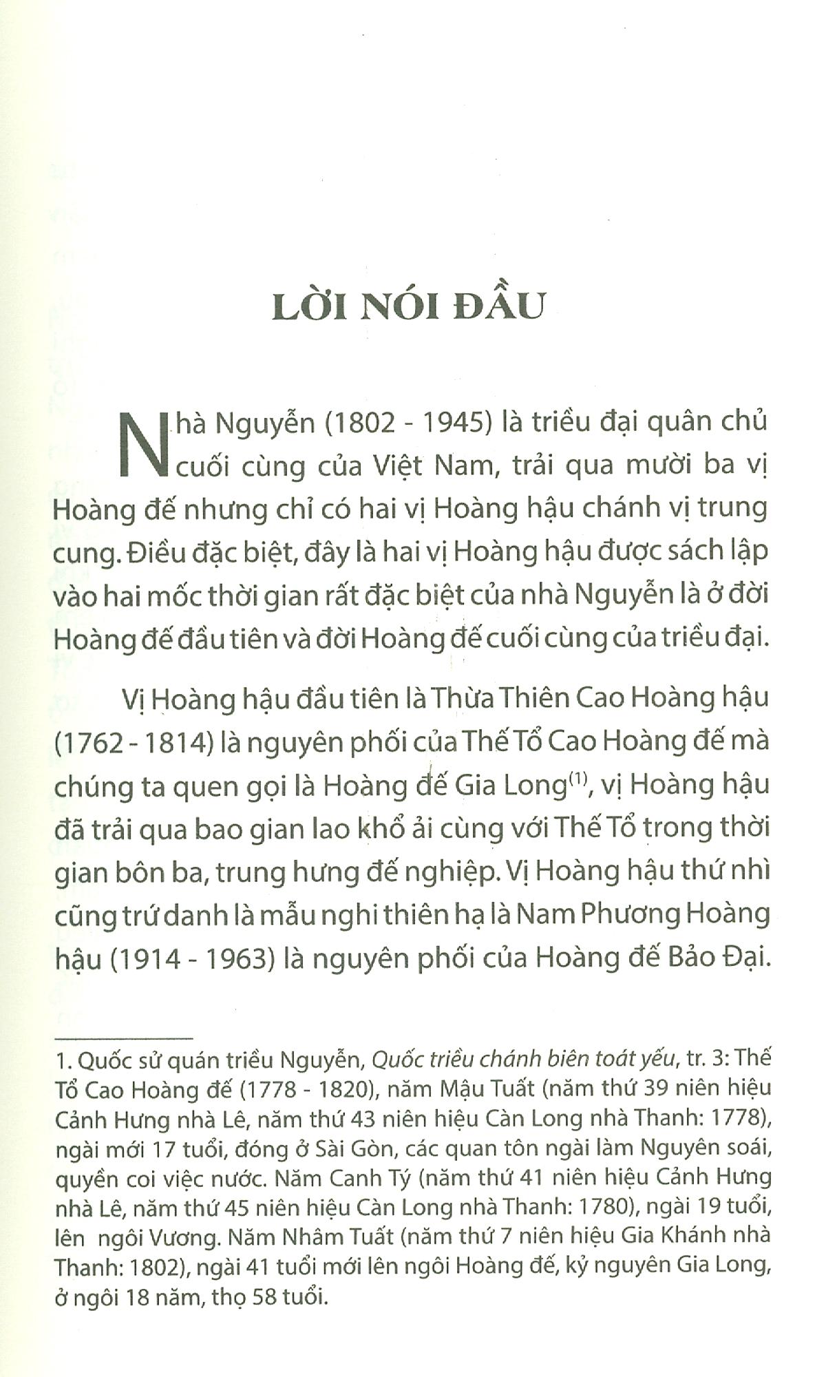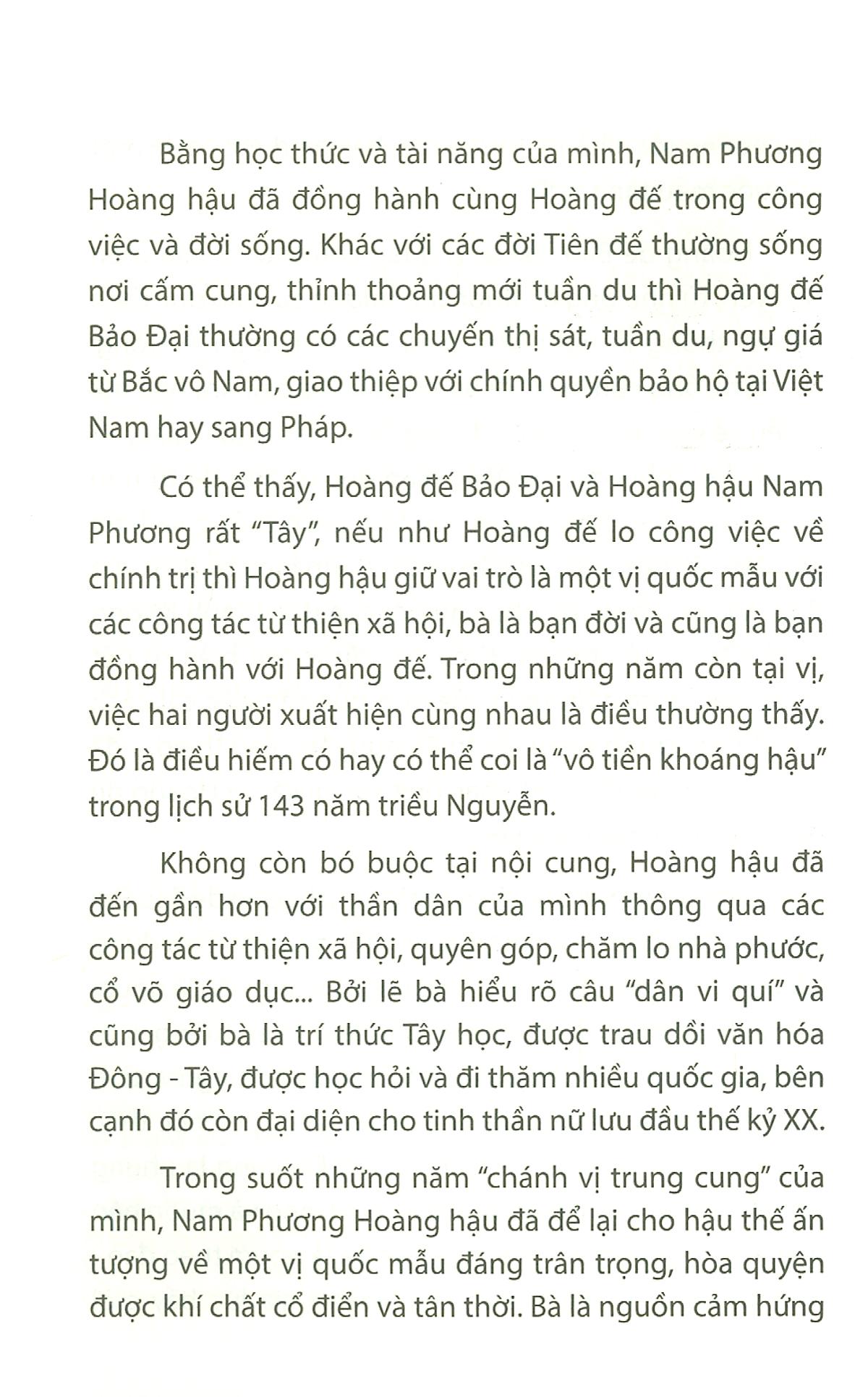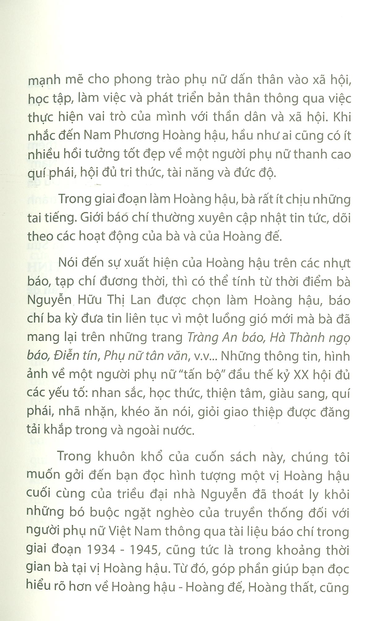 Trong khuôn khổ của cuốn sách này, chúng tôi muốn gởi đến bạn đọc hình tượng một vị Hoàng hậu cuối cùng của triều đại nhà Nguyễn đã thoát ly khỏi những bó buộc ngặt nghèo của truyền thống đối với người phụ nữ Việt Nam thông qua tài liệu báo chí trong giai đoạn 1934 - 1945, cũng tức là trong khoảng thời gian bà tại vị Hoàng hậu. Từ đó, góp phần giúp bạn đọc hiểu rõ hơn về Hoàng hậu Hoàng đế, Hoàng thất, cũng như những công việc mà Hoàng hậu Nam Phương đã làm có ảnh hưởng đến công cuộc trị vì và giúp đỡ cho thần dân của m.ình lúc bấy giờ”.