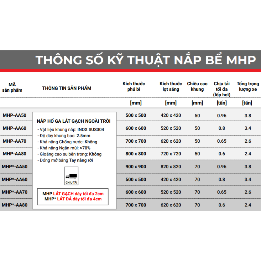 - Cấp chịu tải CLASS A (ZAVAK): 0.96 tấn/nắp, chịu tải cho xe 3.8 tấn.