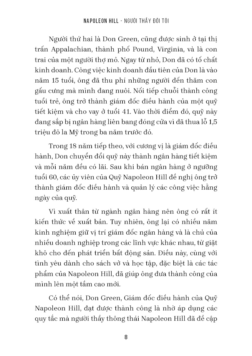 Don Green là Giám đốc điều hành của Quỹ Napoleon Hill và là chủ tịch hội đồng quản trị của Quỹ tại Đại học Virginia-Wise. Ông đã đi khắp nơi, thuyết trình trên toàn thế giới. Ông đã thành công nhờ việc áp dụng những quy tắc mà người thầy thông thái Napoleon Hill đề cập và bàn luận trong các tác phẩm của mình.