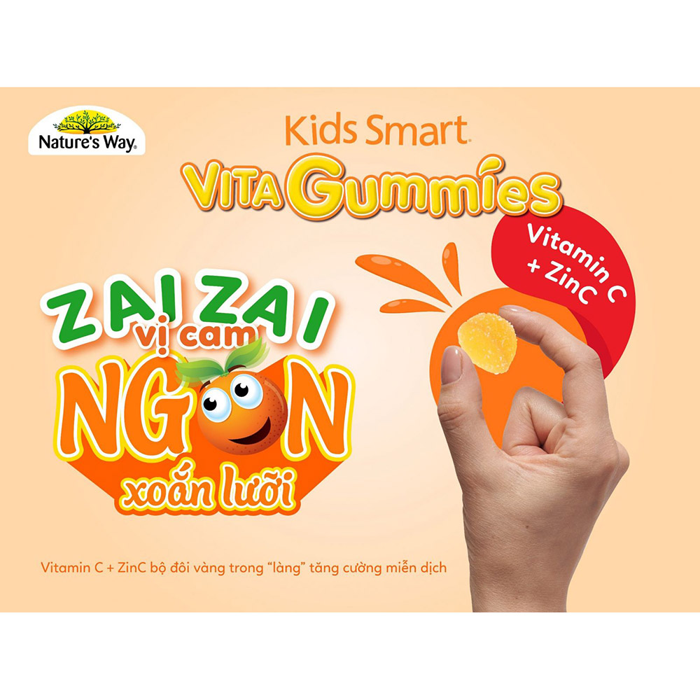 KẸO DẺO BỔ SUNG KẼM & VITAMIN C NATURE'S WAY KIDS SMART VITA GUMMIES VITAMIN C + ZINC CÔNG DỤNG - Giúp bổ sung vitamin C và kẽm, hỗ trợ sức đề kháng. THÀNH PHẦN