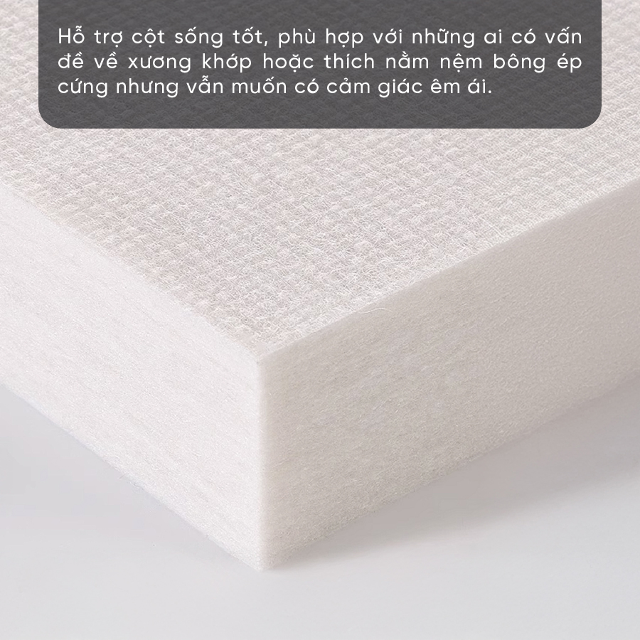 - Chất liệu bông ép cao cấp: Được làm từ bông polyester tinh khiết, ép chặt bằng công nghệ hiện đại giúp tăng độ bền và hỗ trợ nâng đỡ cơ thể tốt.
